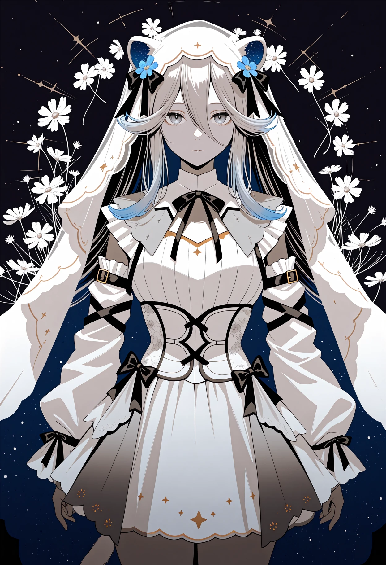 B0tanFfth, grey eyes, gradient hair, grey hair, blue hair, long hair, hair flaps, hair bow, animal ears, tail, white veil, flower ornament, black ribbon, neck ribbon, detached collar, white dress, short dress, detached sleeves, white sleeves, white corset, two-tone cape, white leggings, detached leggings, white shoes
