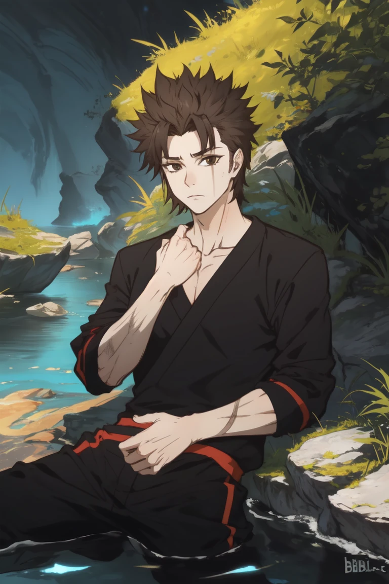 1boy, 20 years old boy, masculine, pale skin, medium brown hair, black eyes, vertical scar on his left eye