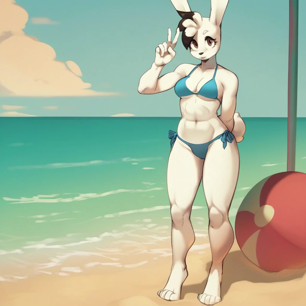 Rabbit, bunny girl, white fur, white and black fur, brown eyes, long ears, medium breasts,