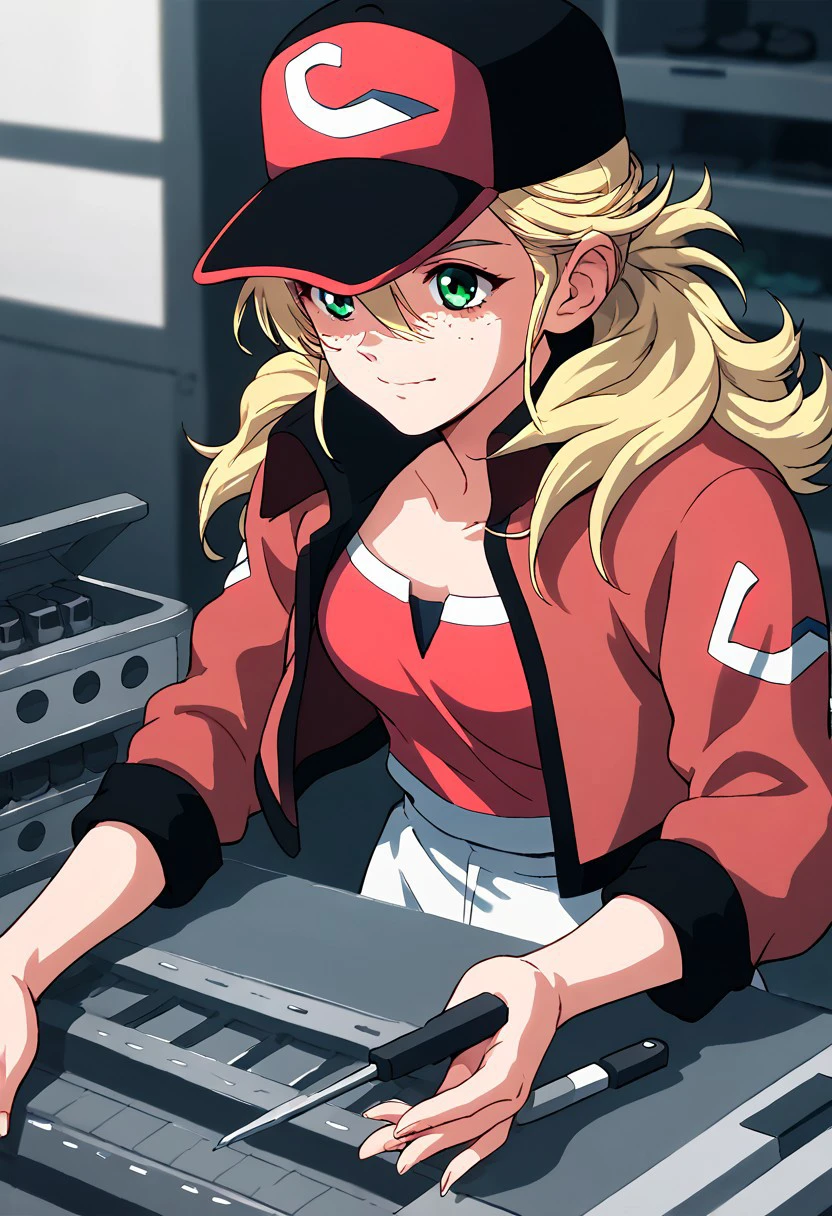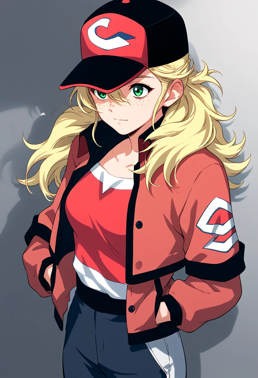 kay nimrod, freckles, green eyes, brond hair, long hair, jacket, cap,