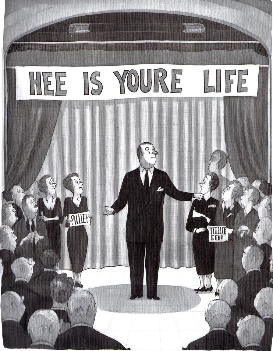 a drawing of a woman in a black dress is standing in front of a table in the style of charles-addams
