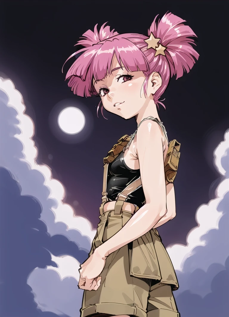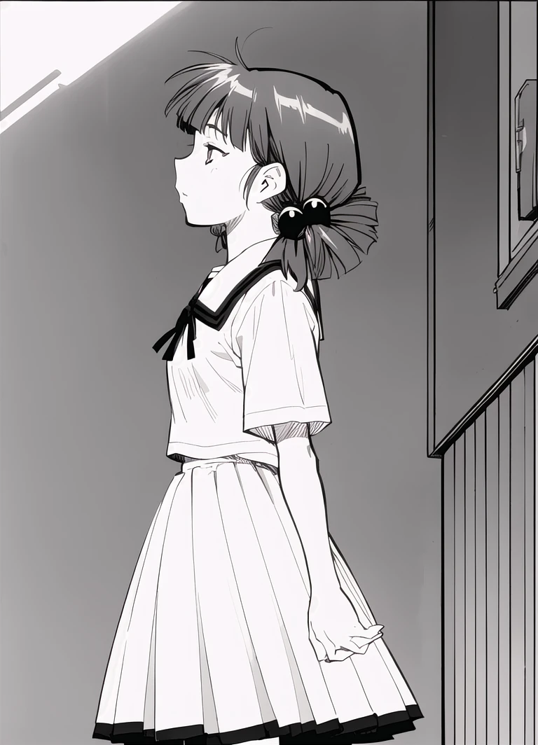 low twintails, hair bobbles, white collared shirt, short sleeves, green neck ribbon, white pleated skirt