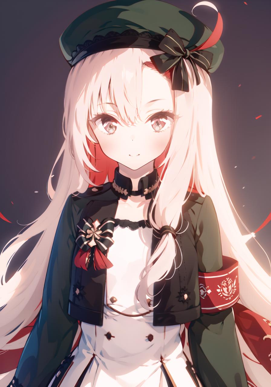 与她的妹妹西南风类似,这个LoRA的关键词为maestrale \(azur lane\), multicolored hair, white_hair, red_hair, bangs, red_eyes, very_long_hair, open_jacket, beret, cropped_jacket, green_jacket, green_headwear, long_sleeves, hair_bow, stripped_bow, strapless dress, white_dress, knee boots, black_thighhighs, detached_collar, armband