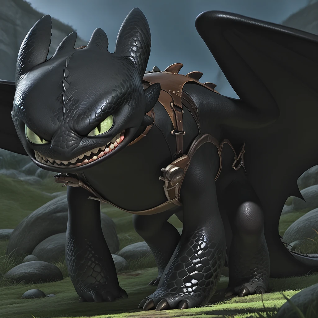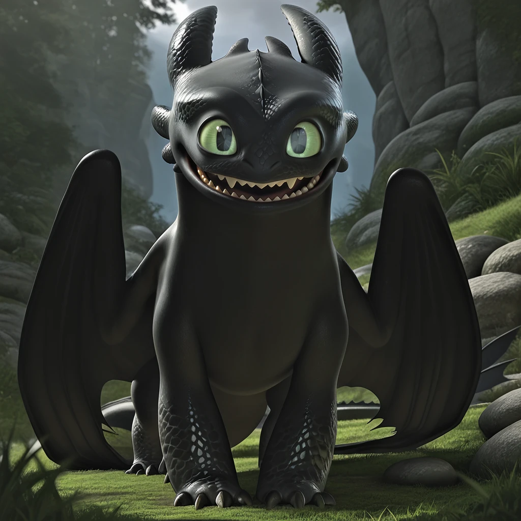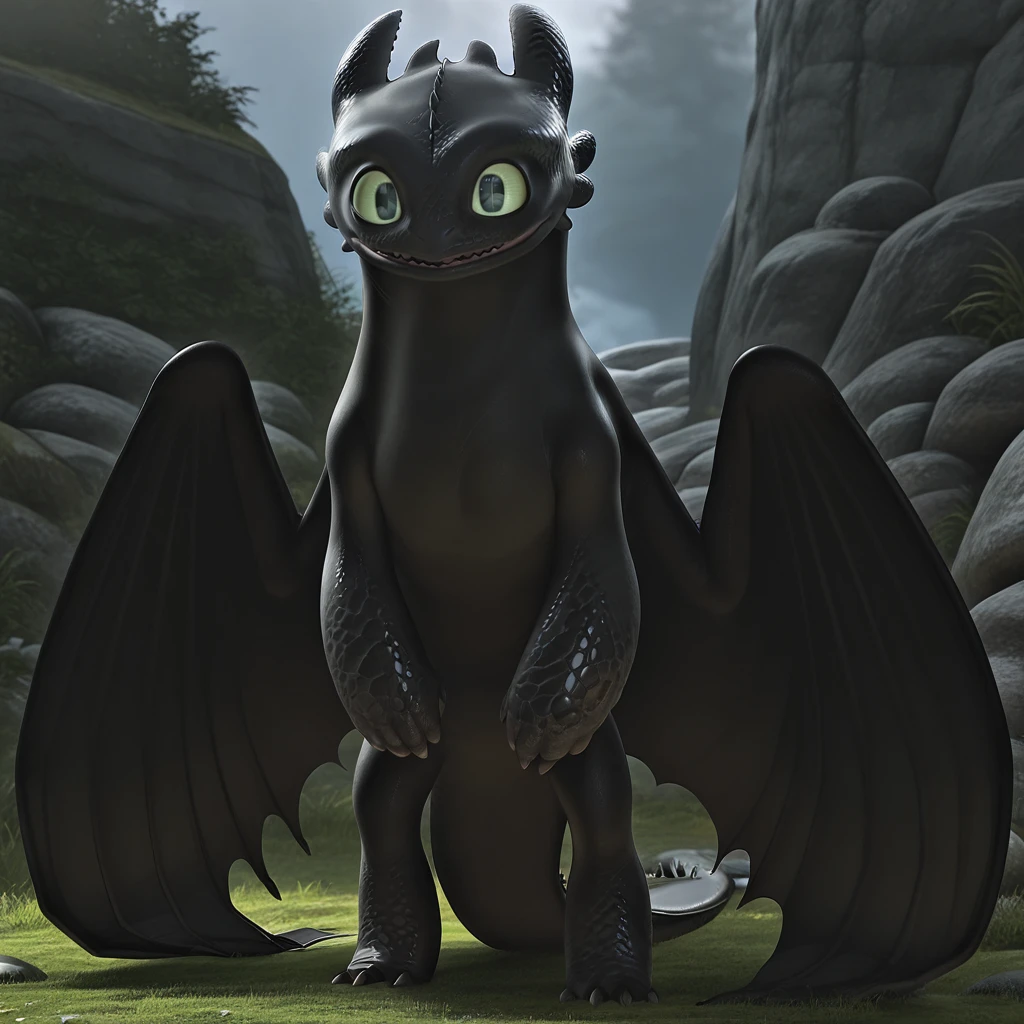 1boy, male, furry male, reptile, dragon, feral, quadruped, solo, black skin, black scales, green eyes, rectangular-shaped pupils, sharp claws, black wings, black webbing, long tail, tail fins