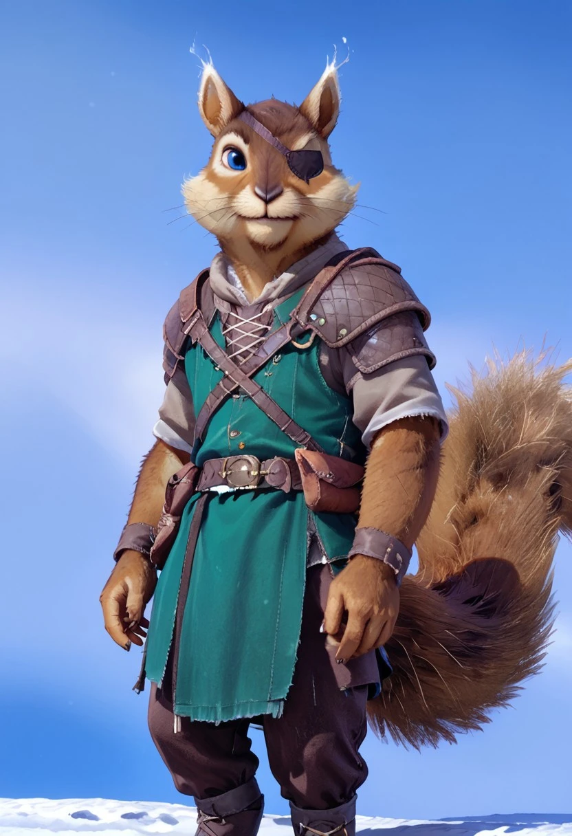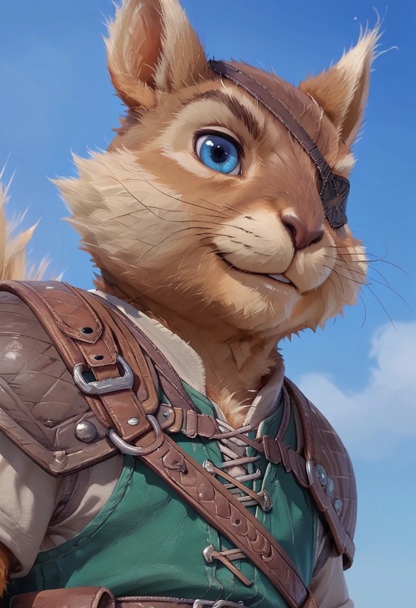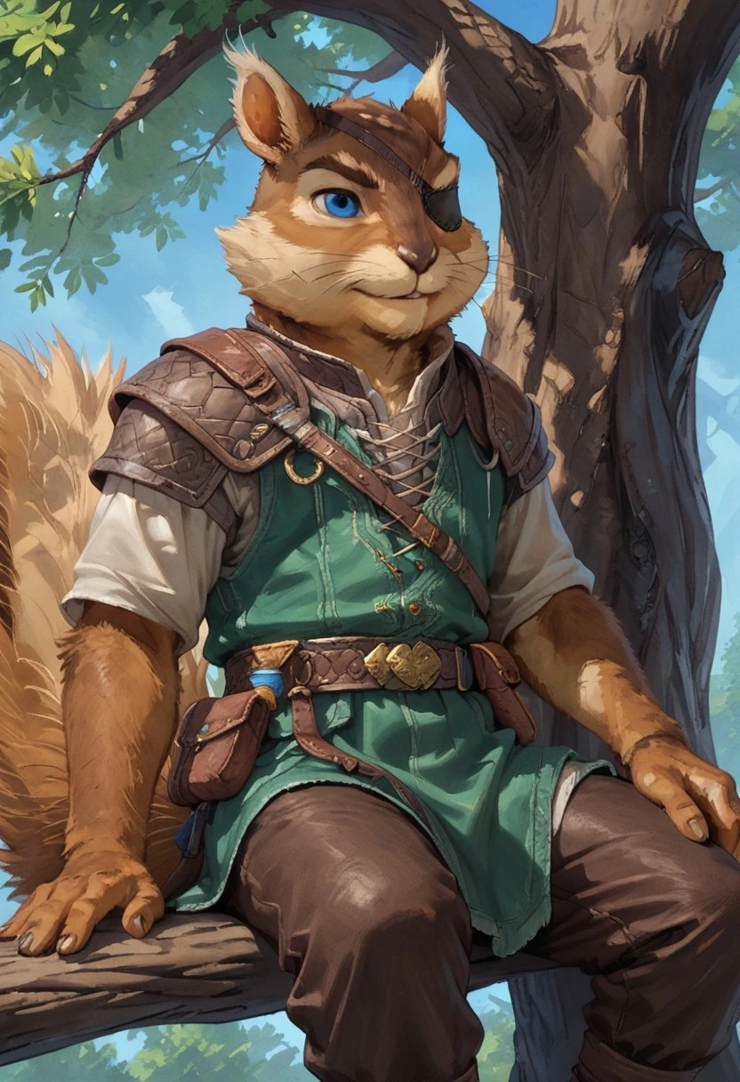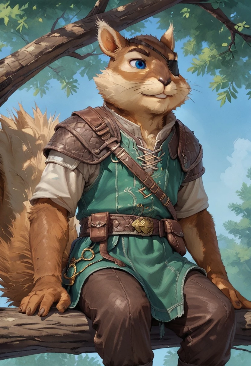 1boy, furry, animal, male, furry male, squirrel, brown fur, animal ears, bushy tail, squirrel tail, blue eyes, eye patch, green vest, leather armor, brown pants, belts