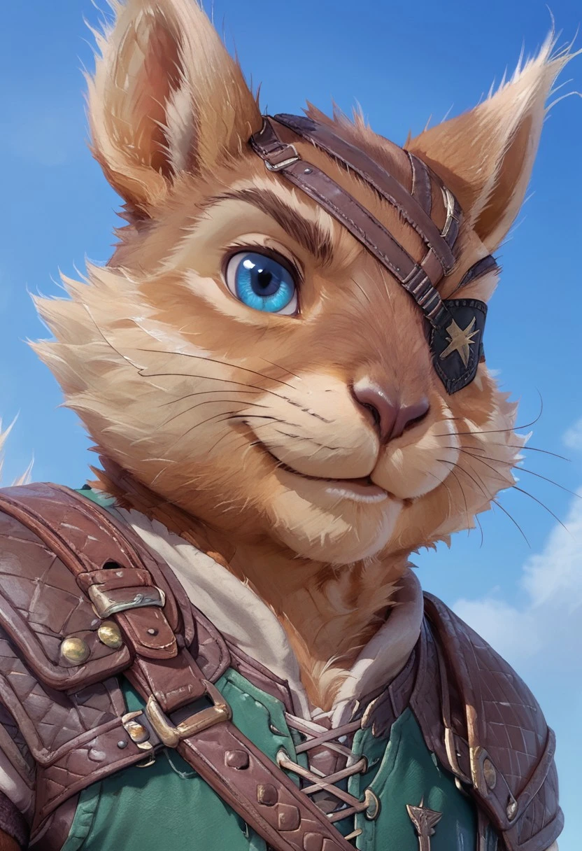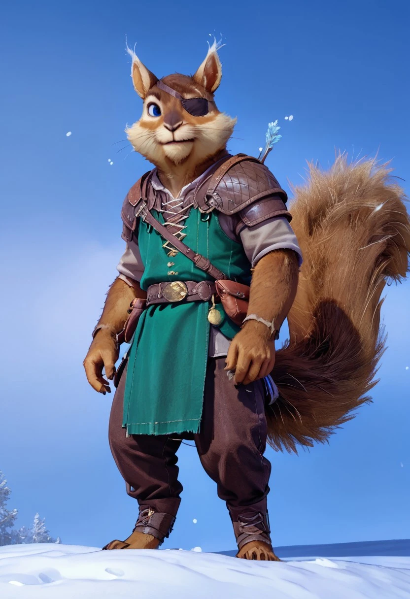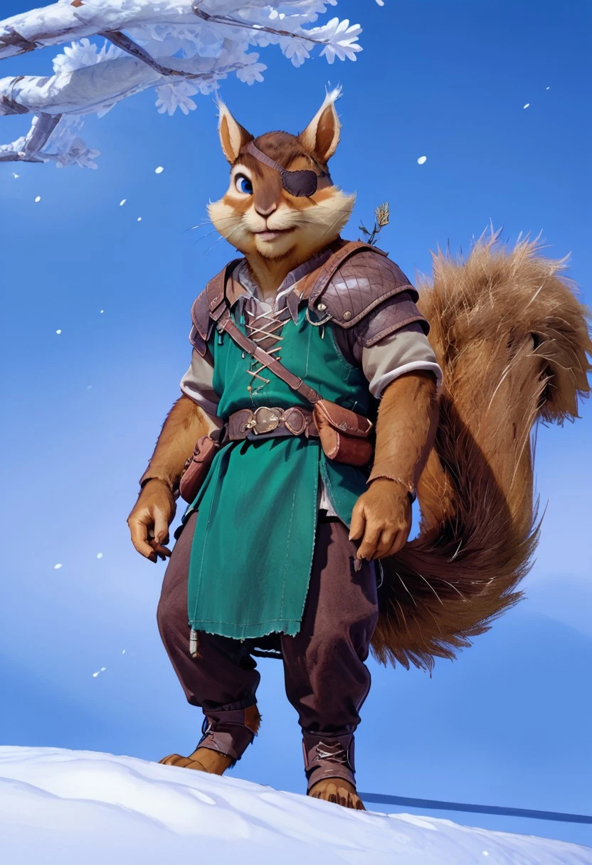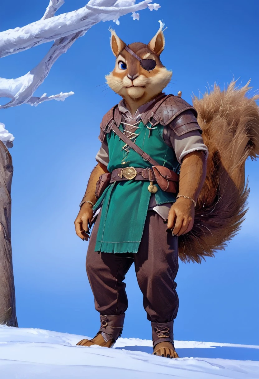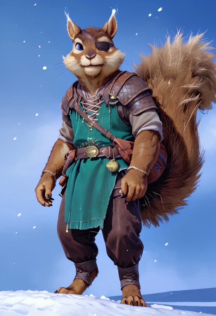 1boy, furry, animal, male, furry male, squirrel, brown fur, animal ears, bushy tail, squirrel tail, blue eyes, eye patch, green vest, leather armor, brown pants, belts