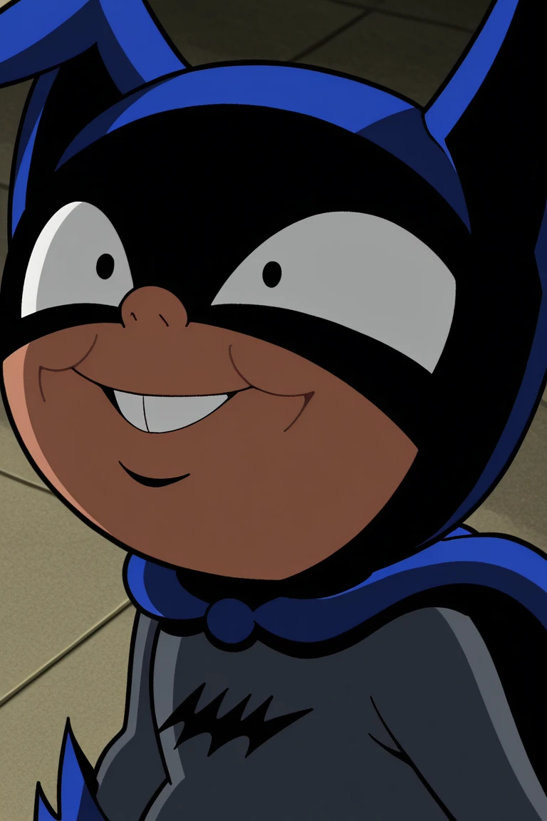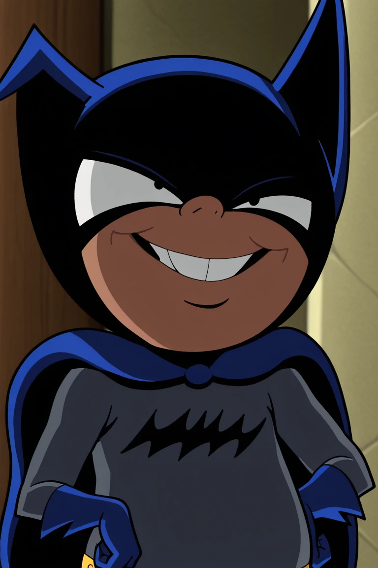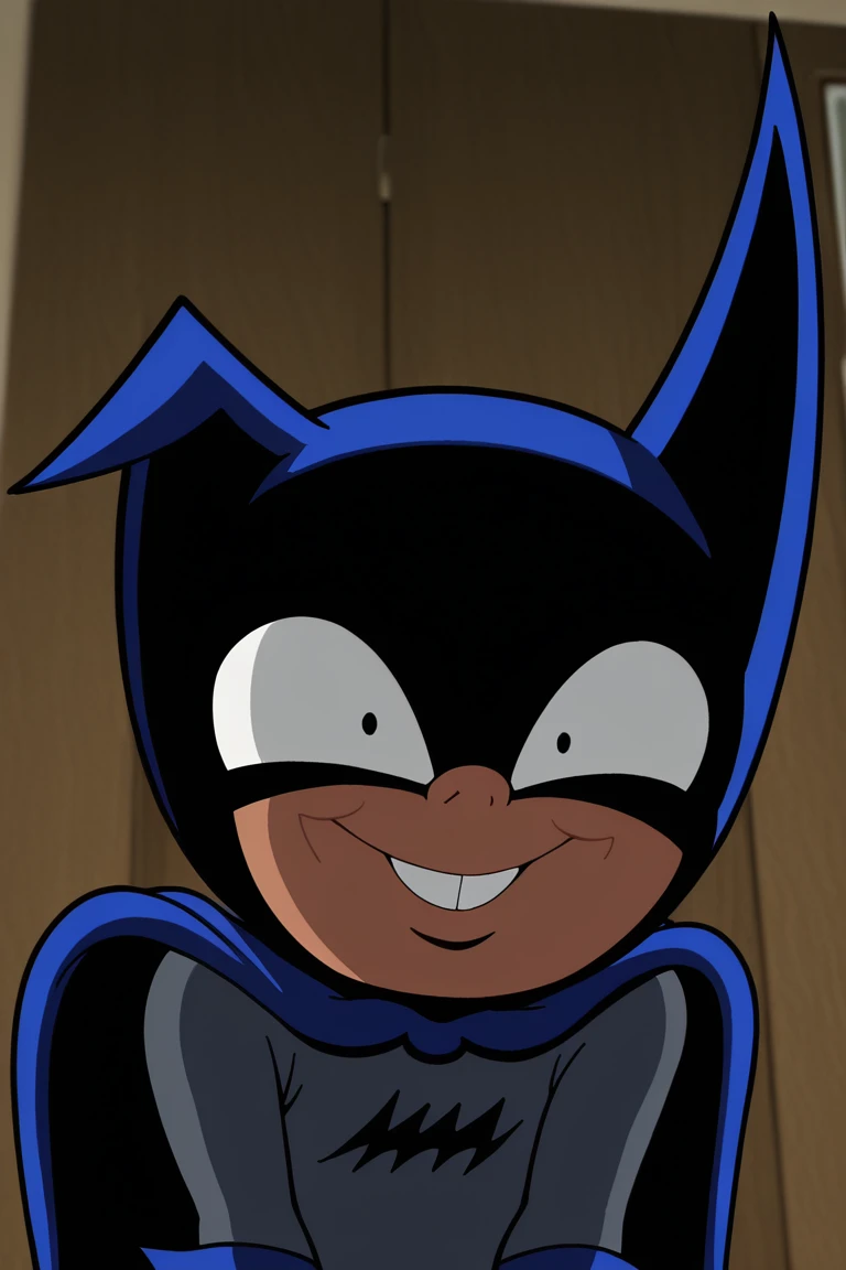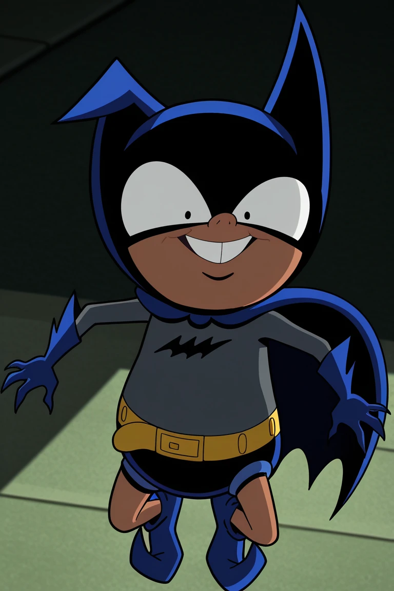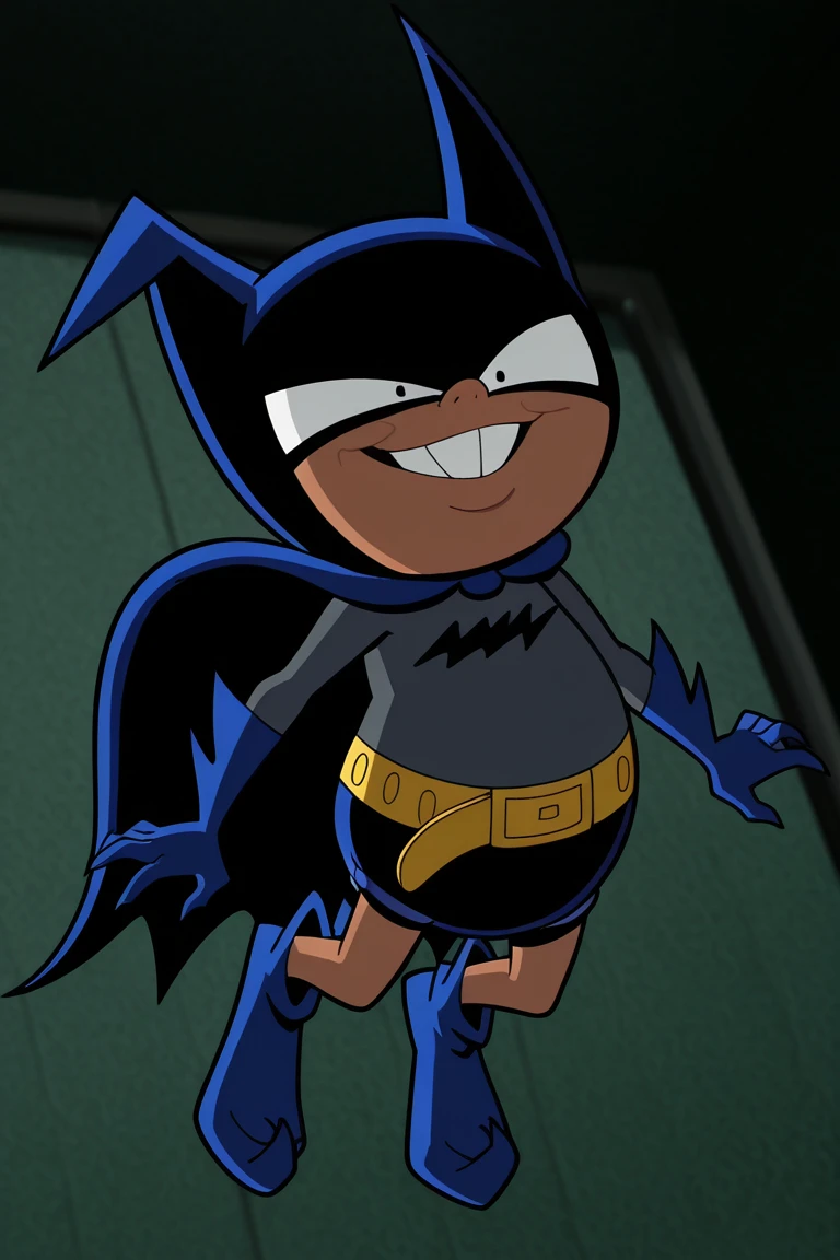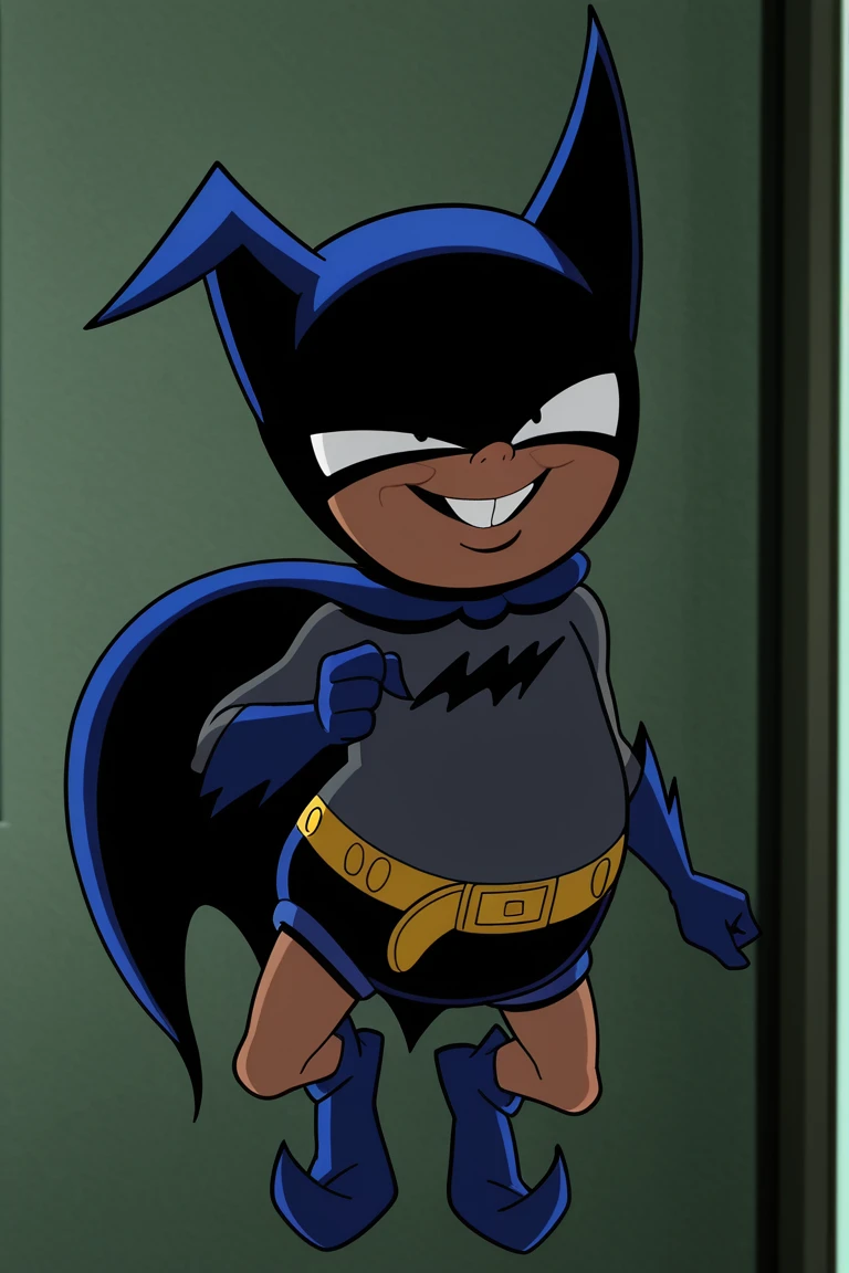 Bat-Mite, solo, 1boy, imp, buck teeth, black eyes, wearing batman costume, black and blue mask, bat theme mask, blue cape, black inner cape, black lighting chest emblem, dark grey suit, blue gloves, black and blue shorts, utility belt, blue boots, floating