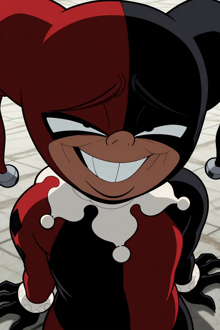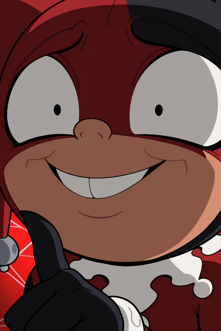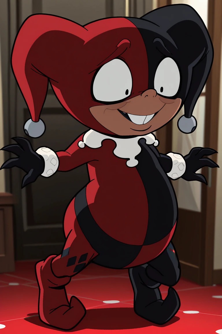 Harley Quinn outfit: Bat-Mite ilus, solo, 1boy, imp, buck teeth, black eyes, wearing harley quinn costume, black and red jester cap, white collar, black and red jester bodysuit, black gloves, black and red jester boots