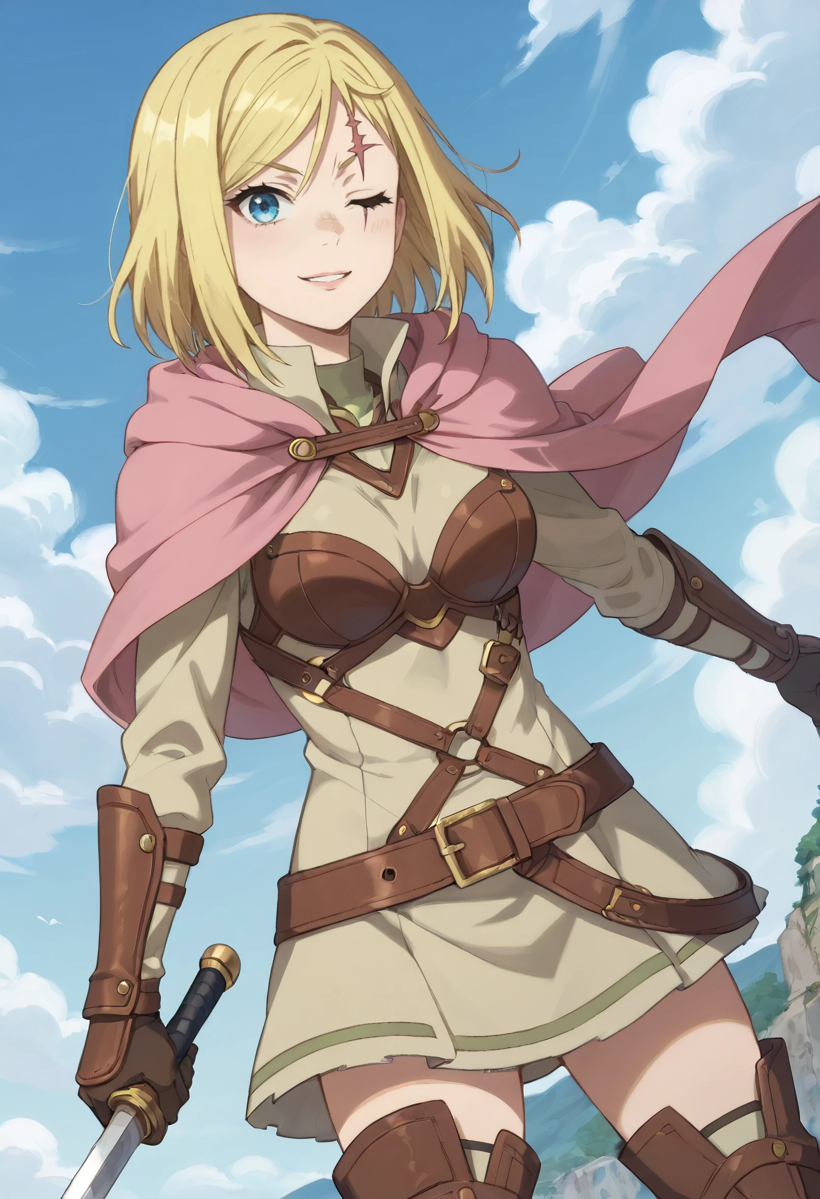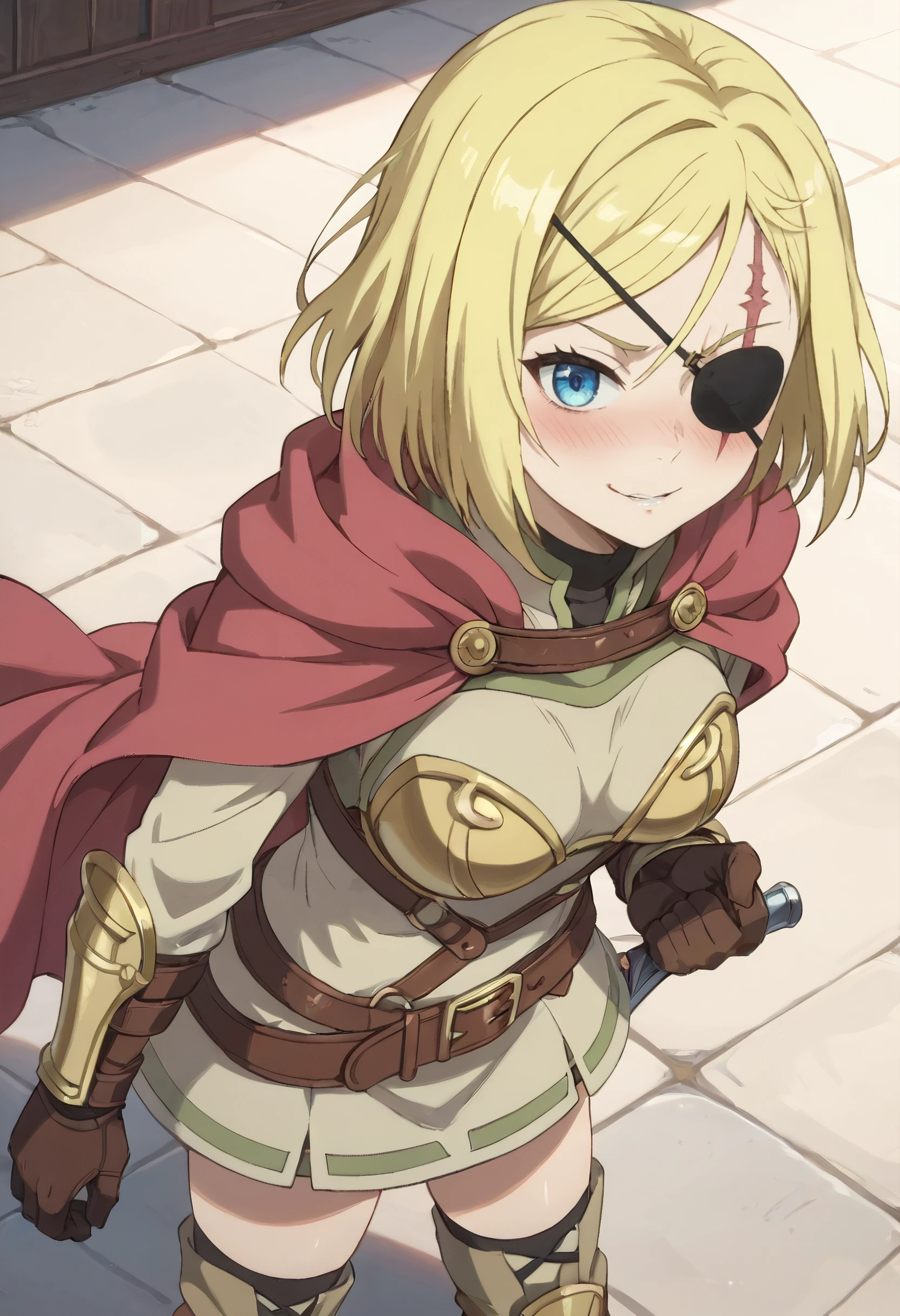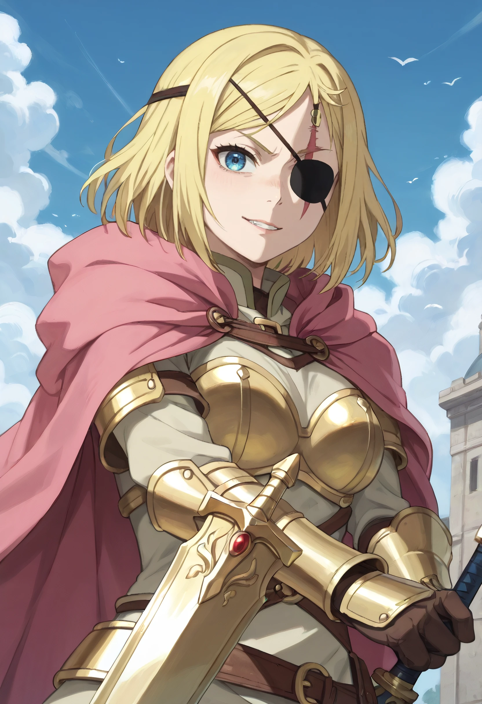 AliciaHeavyArmor, helmet, armor, cape, headpiece, jewelry, lips, breastplate, gloves, military, headgear, pauldrons, blue cape, shoulder armor, weapon, sword,