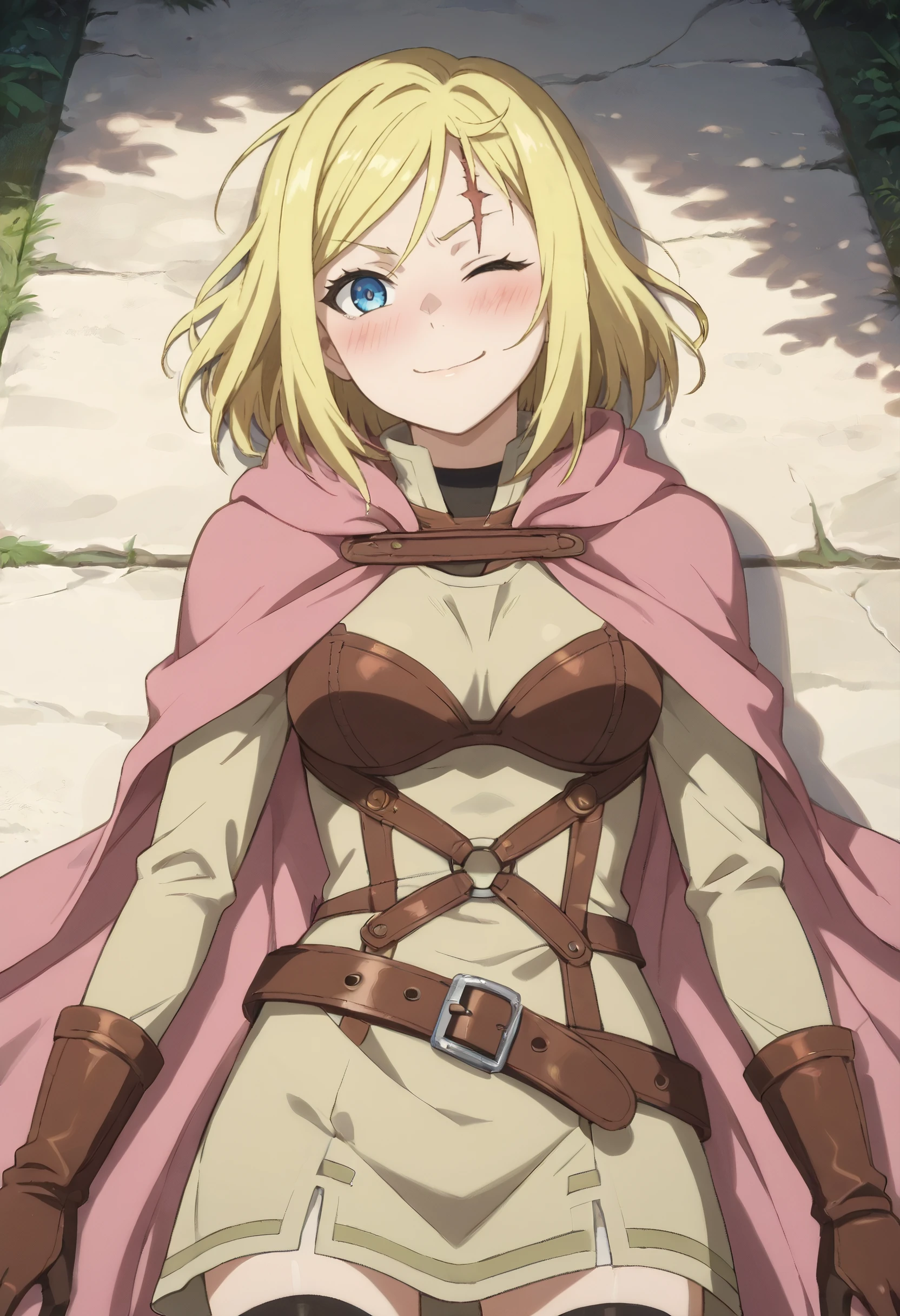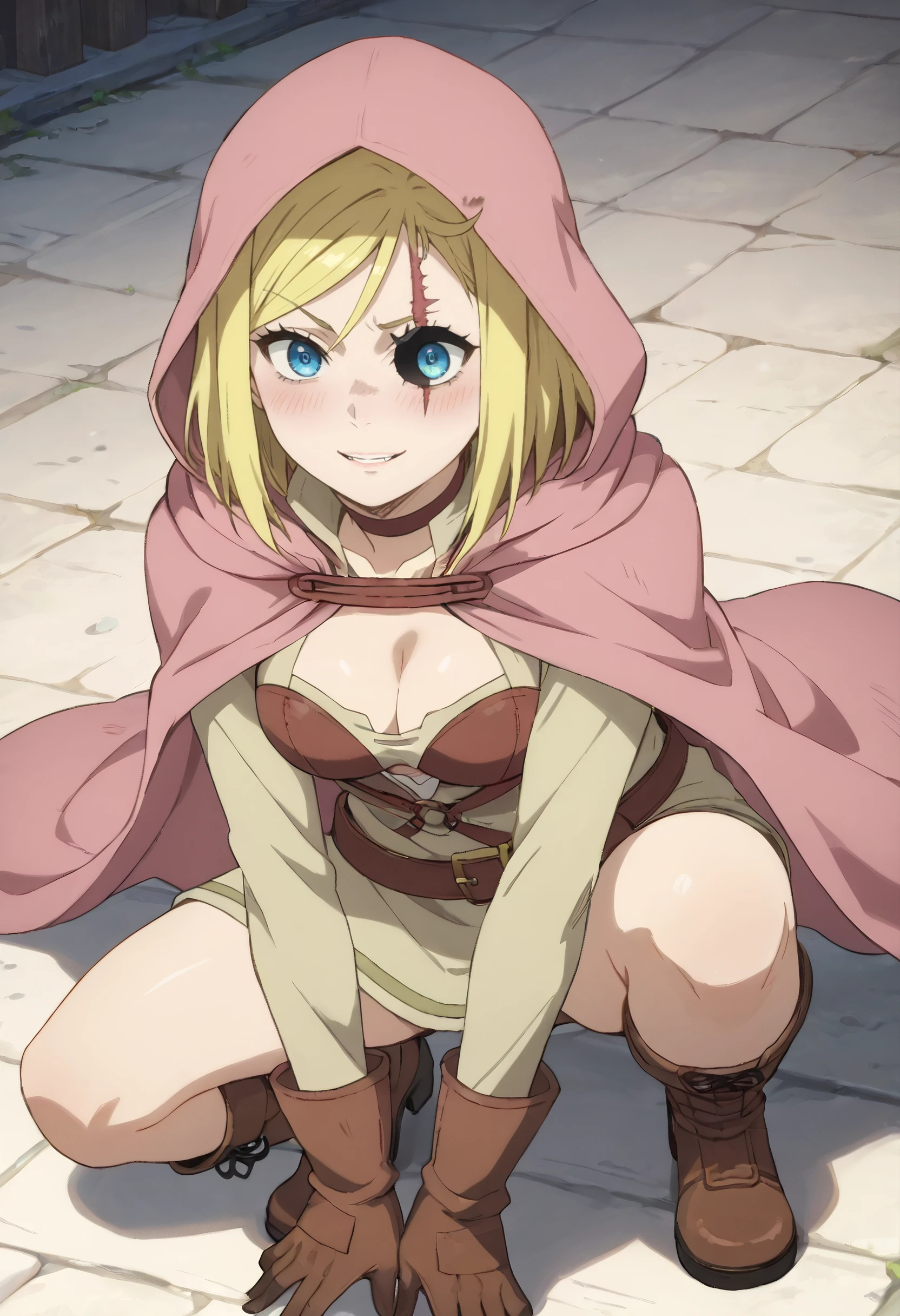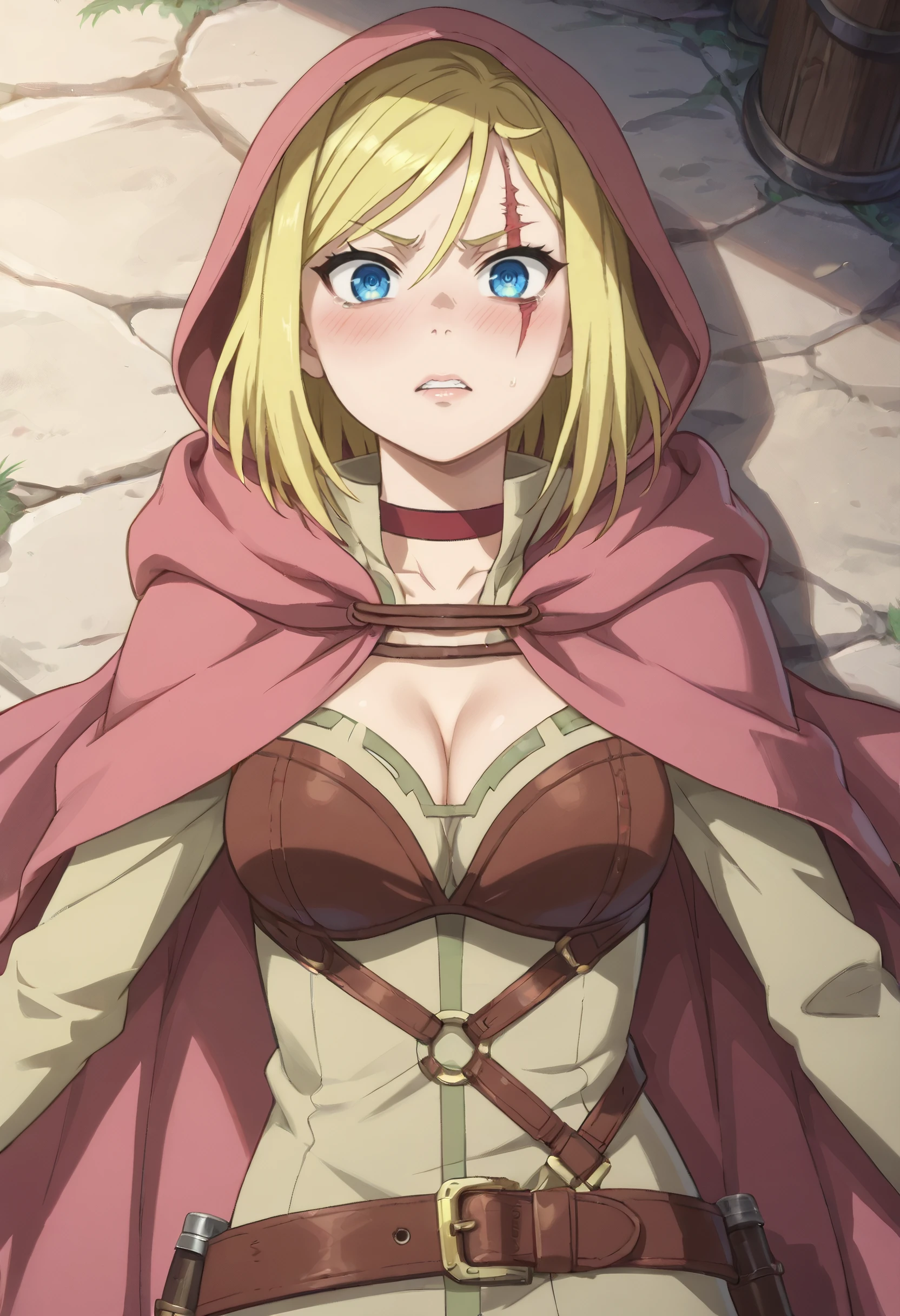 AliciaCape, hood, cape, cloak, hood down, hooded cloak, long sleeves, choker, shirt, collarbone, belt, cleavage, gloves, hooded cape, brown cape, boots,