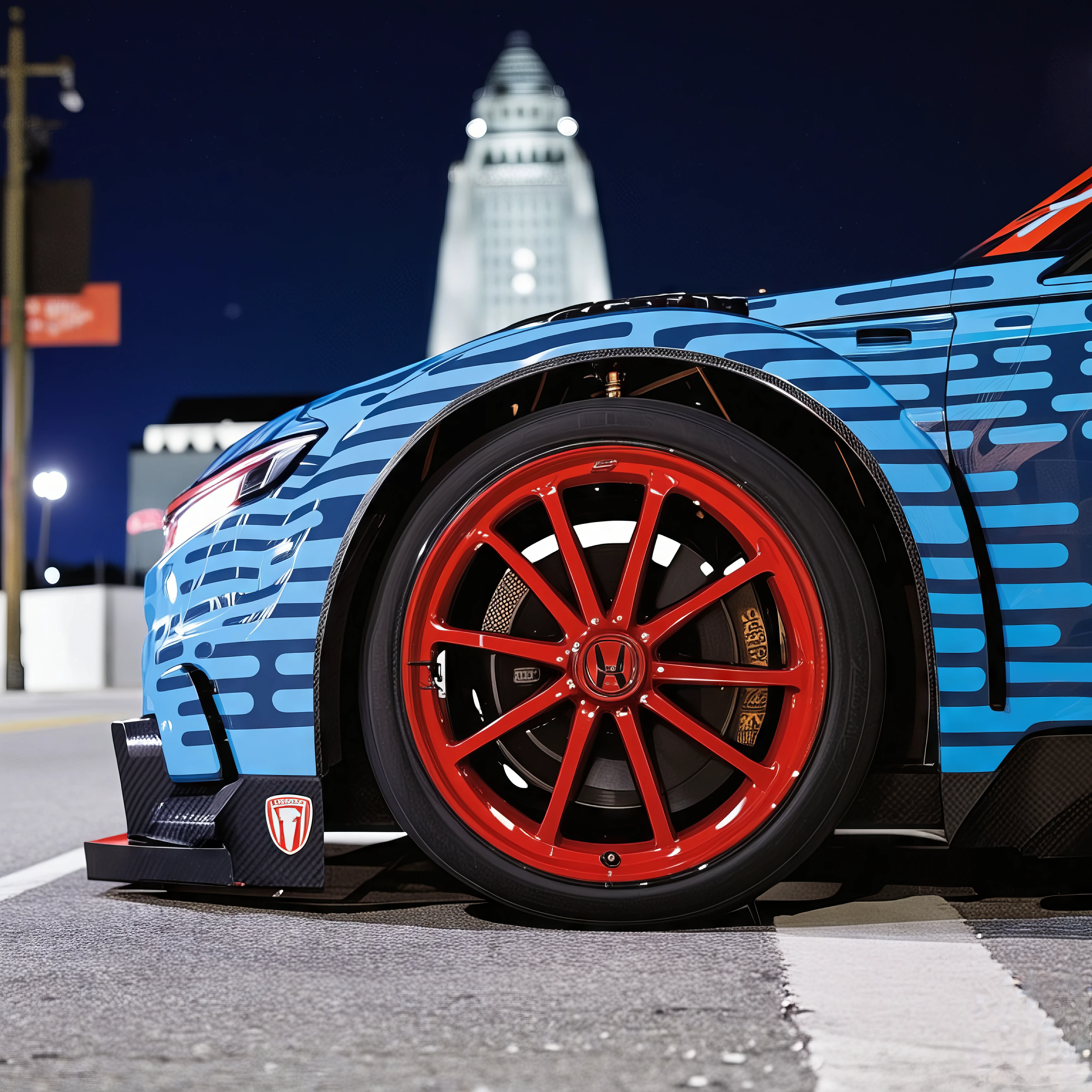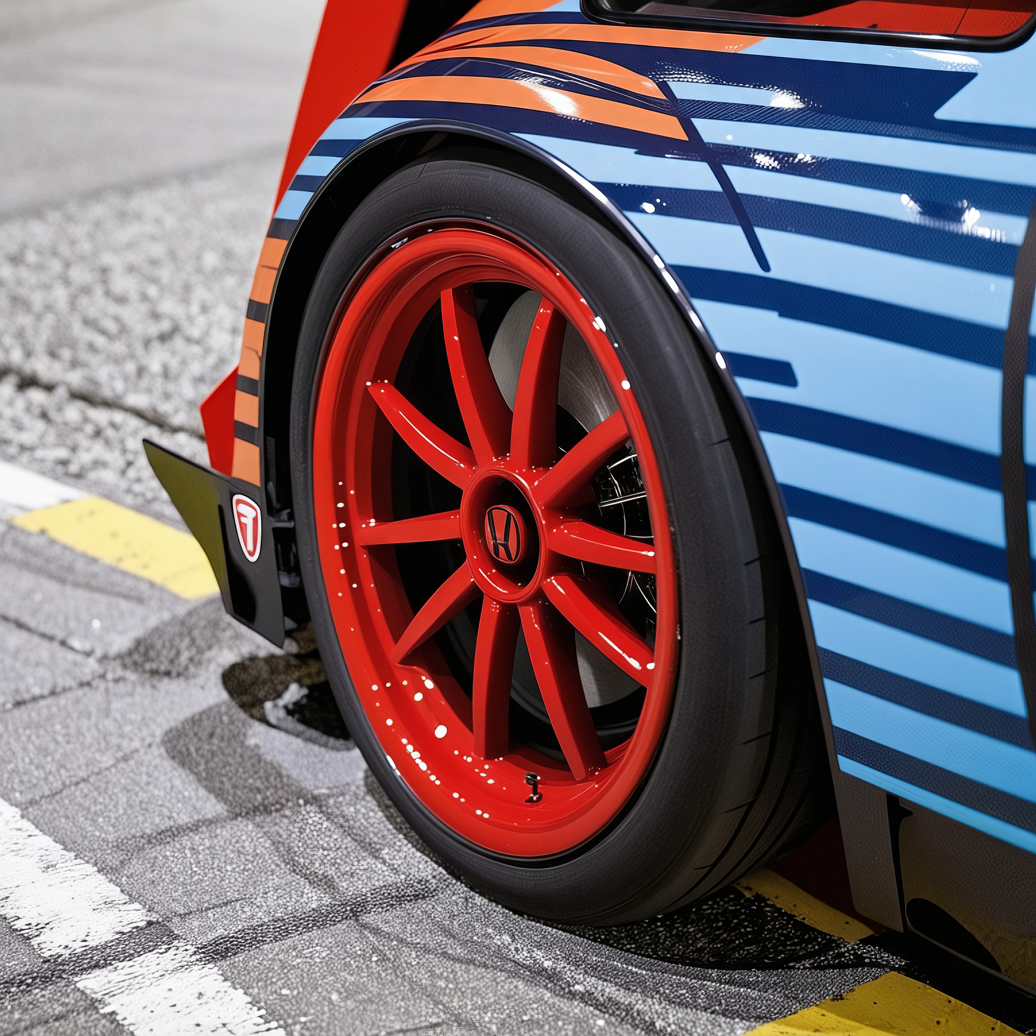 "The graphics were inspired by the hybrid powertrain, radiating from Honda Hybrid Blue to Honda Racing Red to symbolize the duality of the drivetrain," Melikian explained. "While the 'speed squirkles' add a dynamic fun layer and showcase the playful side of Power of Dreams. Throughout the wrap, we have also sprinkled easter eggs like ghosted outlines of Honda-sponsored tracks and an overhead view of the engine that powers the Honda CR-V Hybrid Racer."