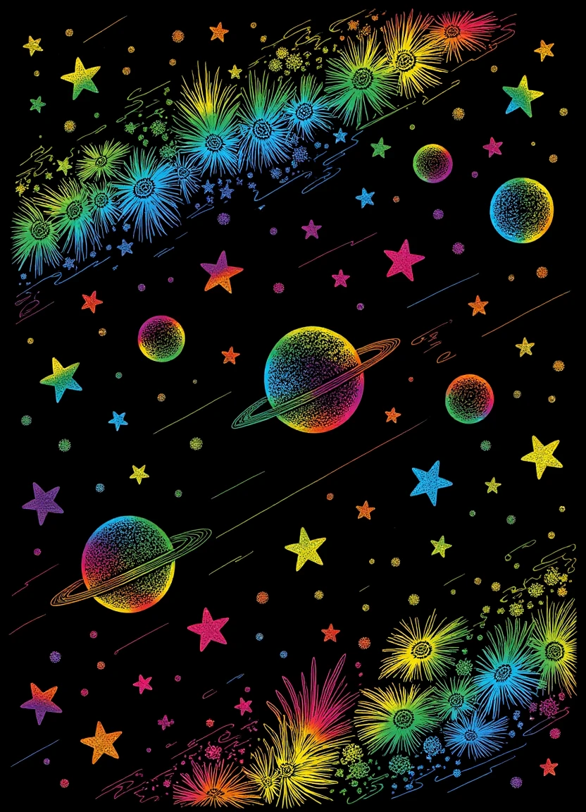 Creates images in the style of scratching off black wax over rainbow colours.