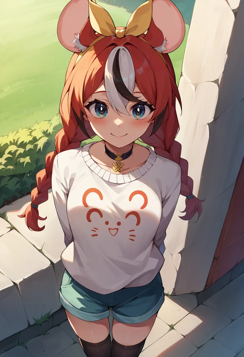 BaelzStrawberry, twin braids, choker, white sweater, shorts, black thighhighsLet me know if you have any issues.