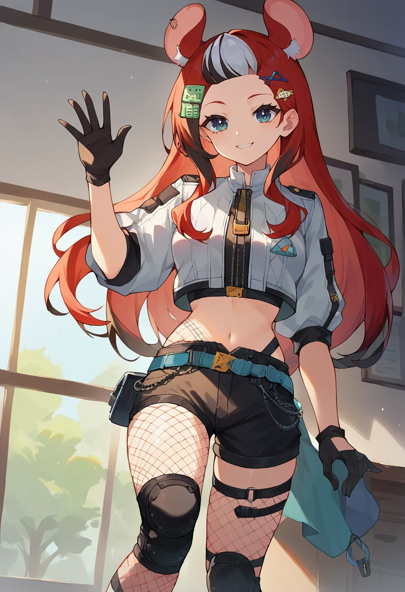 BaelzCasual, long hair, hairclip, crop top, fishnets, gloves, white cropped jacket, black shorts, belt, thighhighs, knee pads
