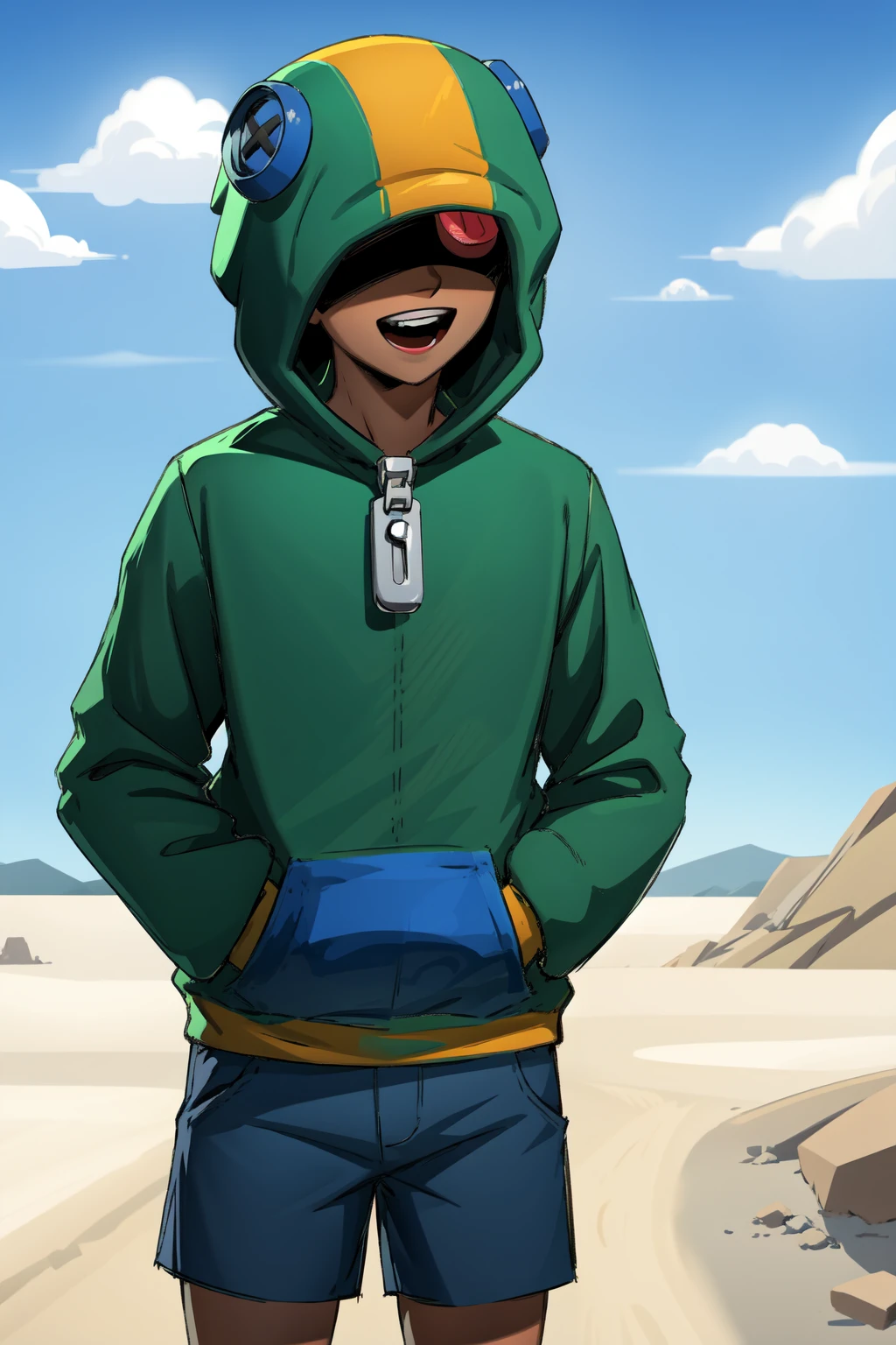 leonBS, solo, male focus, dark skin, shaded face, no eyes visible, hood, green hoodie, zipper, blue shorts, barefoot