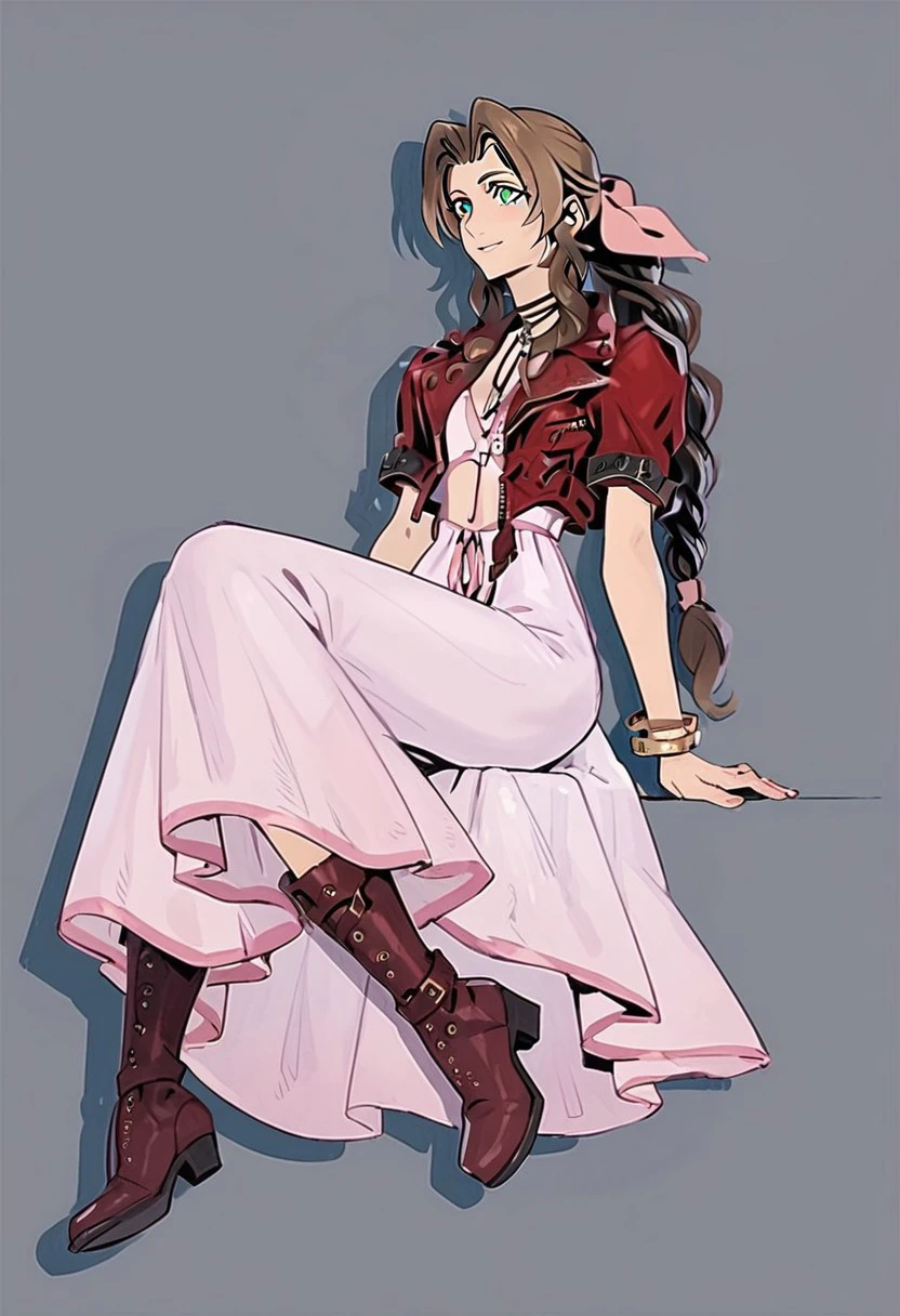 aerith gainsborough, 1girl, solo, long hair, brown hair, jewelry, green eyes, hair ribbon, boots, choker, bracelet, pink bow, staff, pink dress, red jacket, cropped jacket, long dress