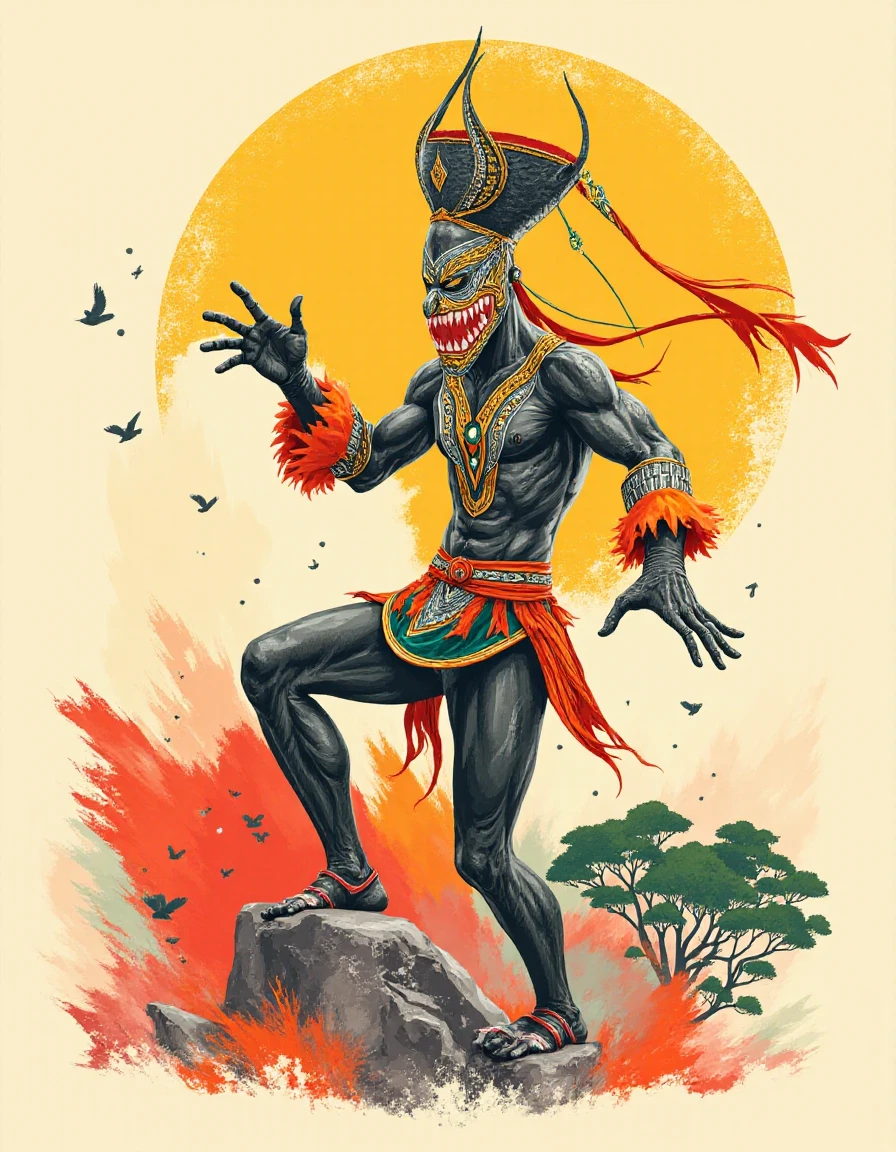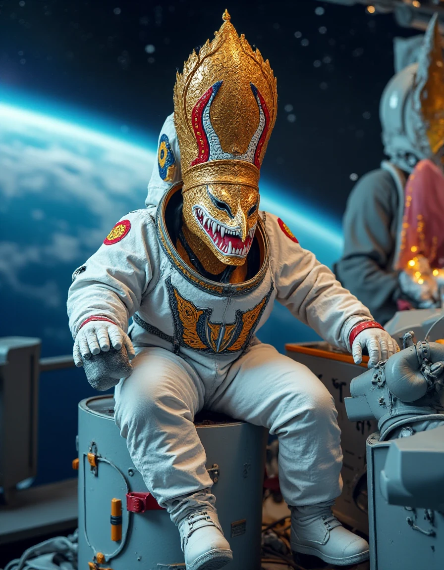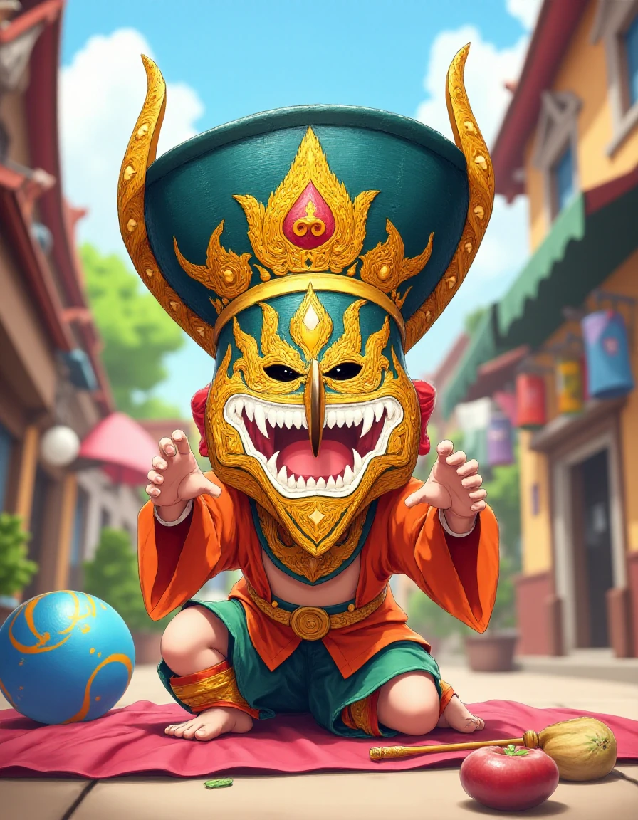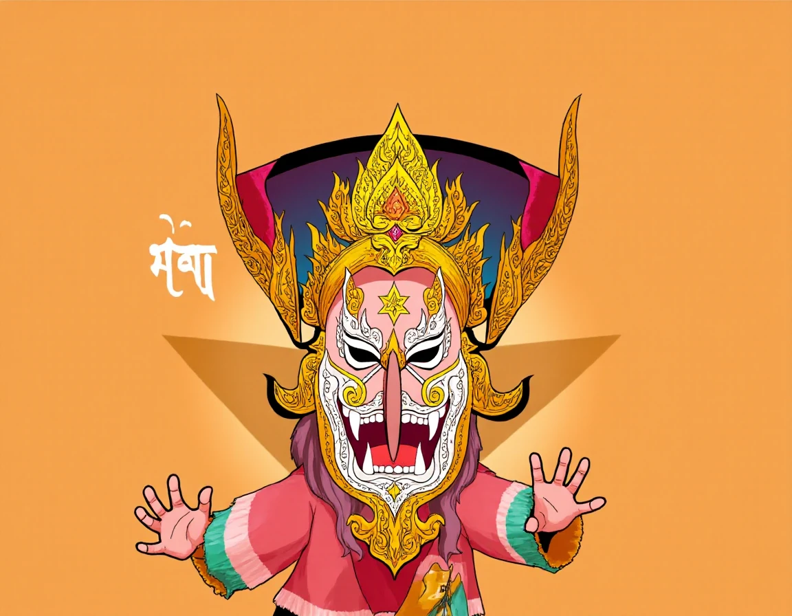 Ghost masks are made of dried sticky rice husk and painted in bright red, green, or other colors and the prominent feature is the long pointed nose. The masks consist of a large head piece made from woven cones used to steam sticky rice. The face is carved out of wood or banana trunks. The costumes were traditionally sewn from old cloth, but locals now wear jumpsuits patched from colorful fabrics.