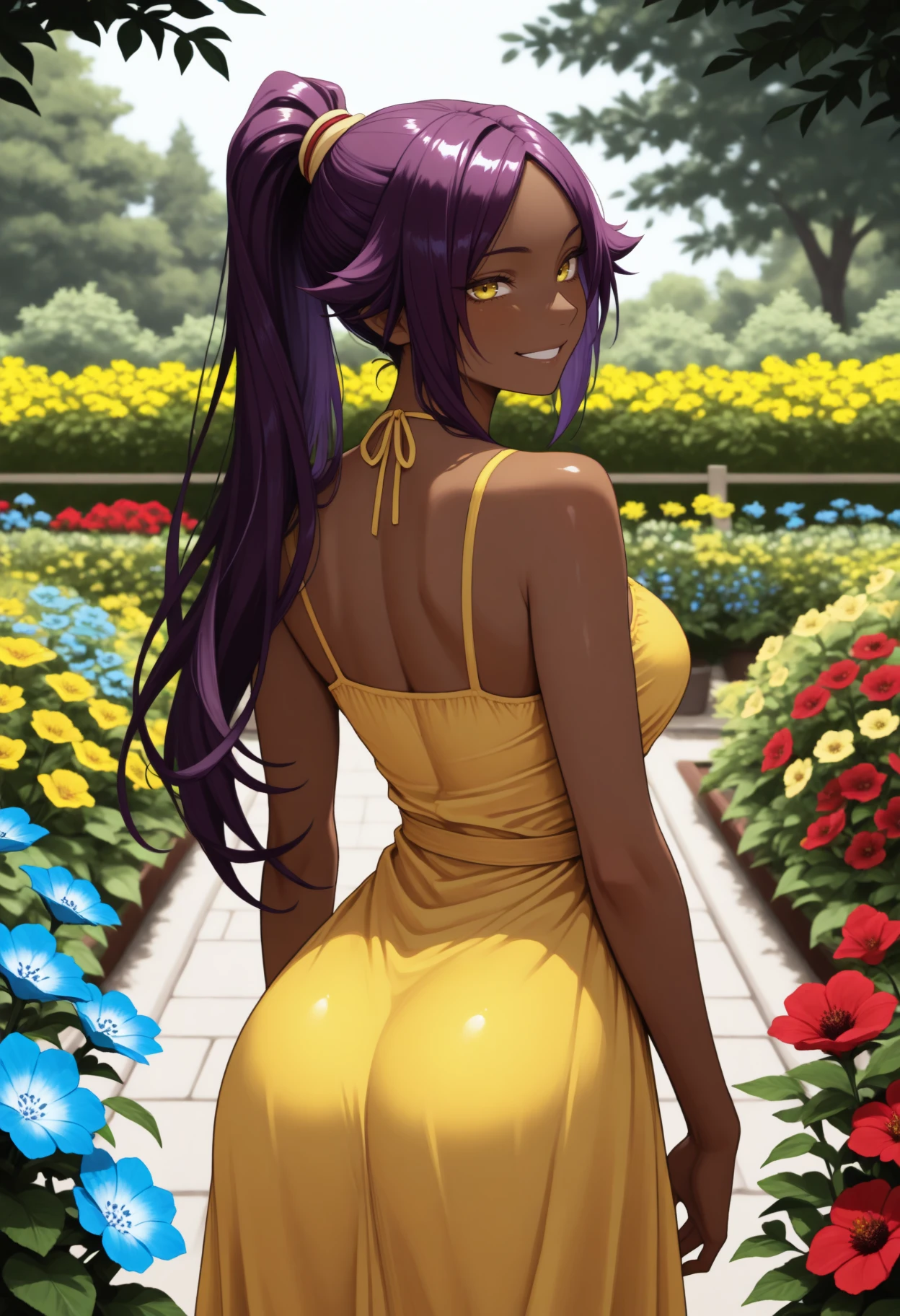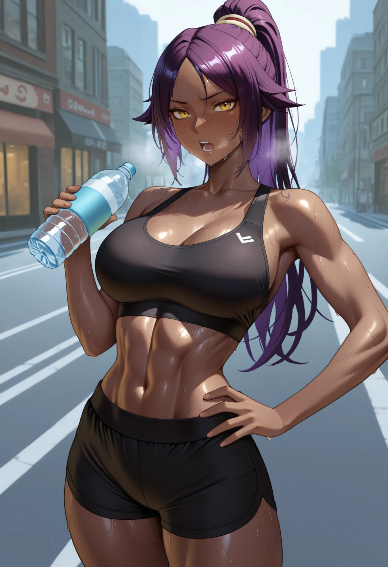 Y0ru1chi, dark-skinned female, yellow eyes, purple hair, long hair, high ponytail, hair tieDefault Outfit (orange one):