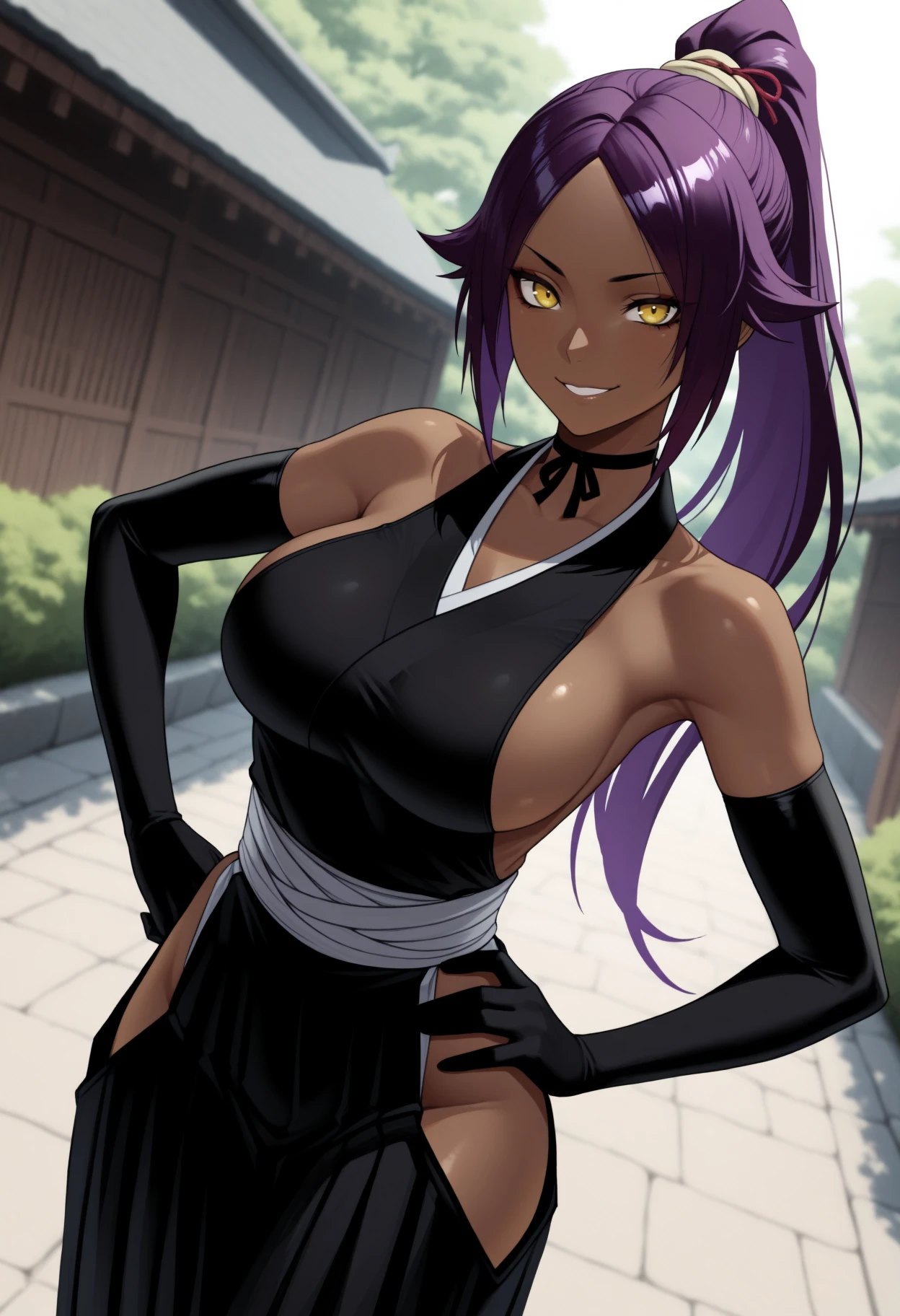 Y0ru1chiCptn, dark-skinned female, yellow eyes, purple hair, long hair, high ponytail, hair tie, black choker, black kimono, sideless kimono, black elbow gloves, sash, hip vent