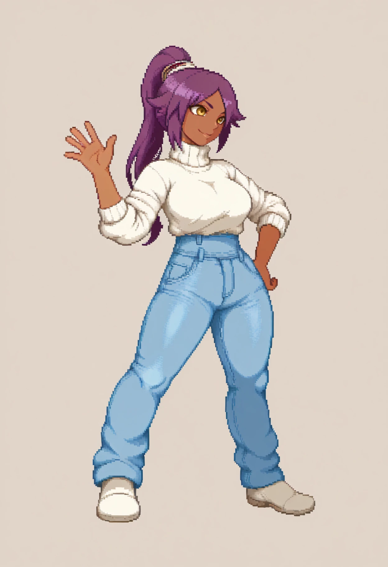 Y0ru1chi, dark-skinned female, yellow eyes, purple hair, long hair, high ponytail, hair tie