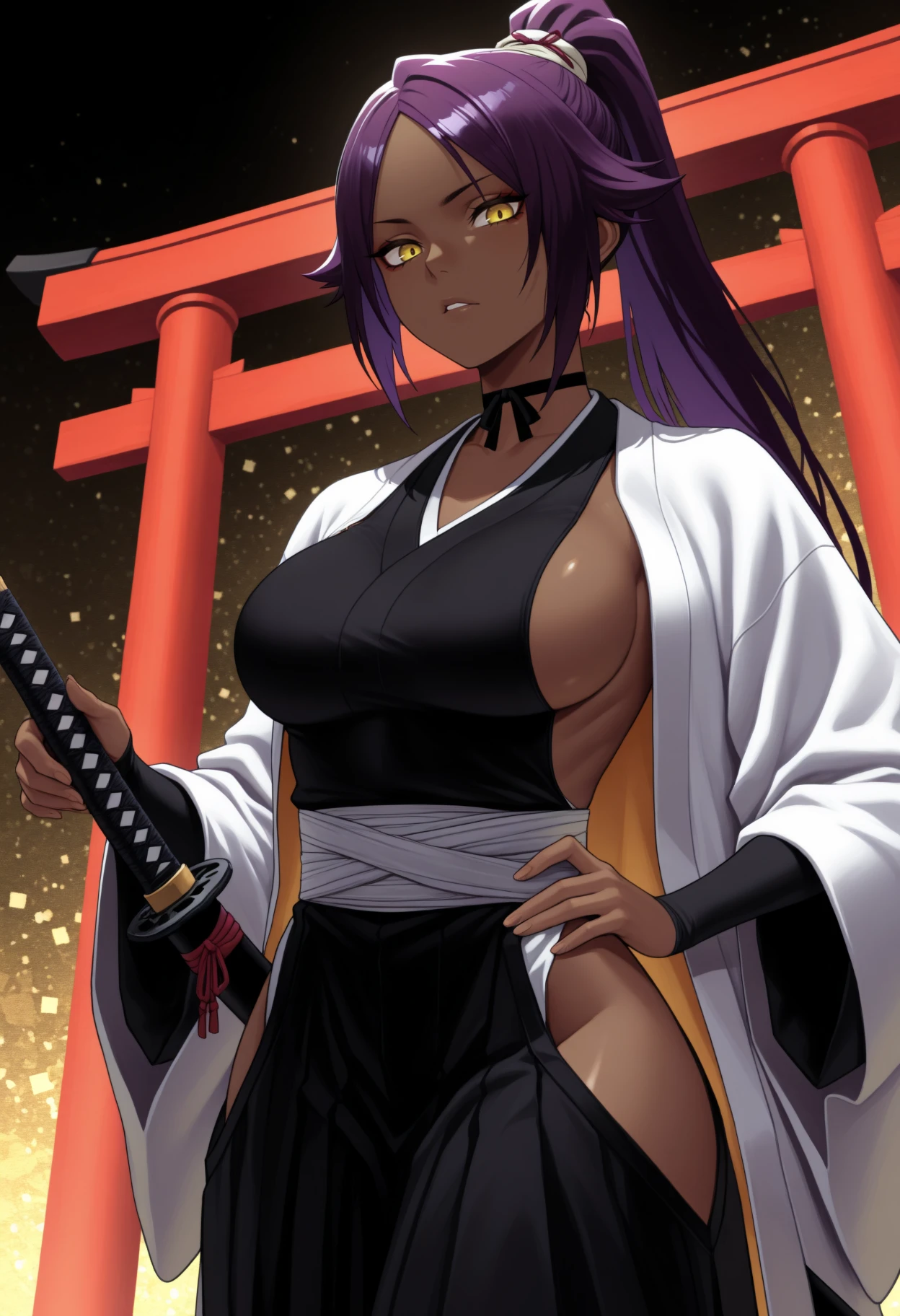 Y0ru1chiCptn, dark-skinned female, yellow eyes, purple hair, long hair, high ponytail, hair tie, black choker, black kimono, sideless kimono, white haori, sash, hip ventLet me know if you have any issues.