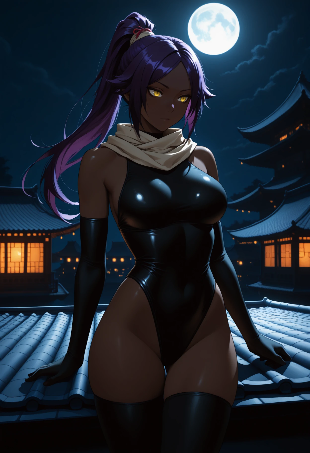Y0ru1chiLeo, dark-skinned female, yellow eyes, purple hair, long hair, high ponytail, hair tie, black leotard, highleg leotard, scarf, black elbow gloves, black thighhighs