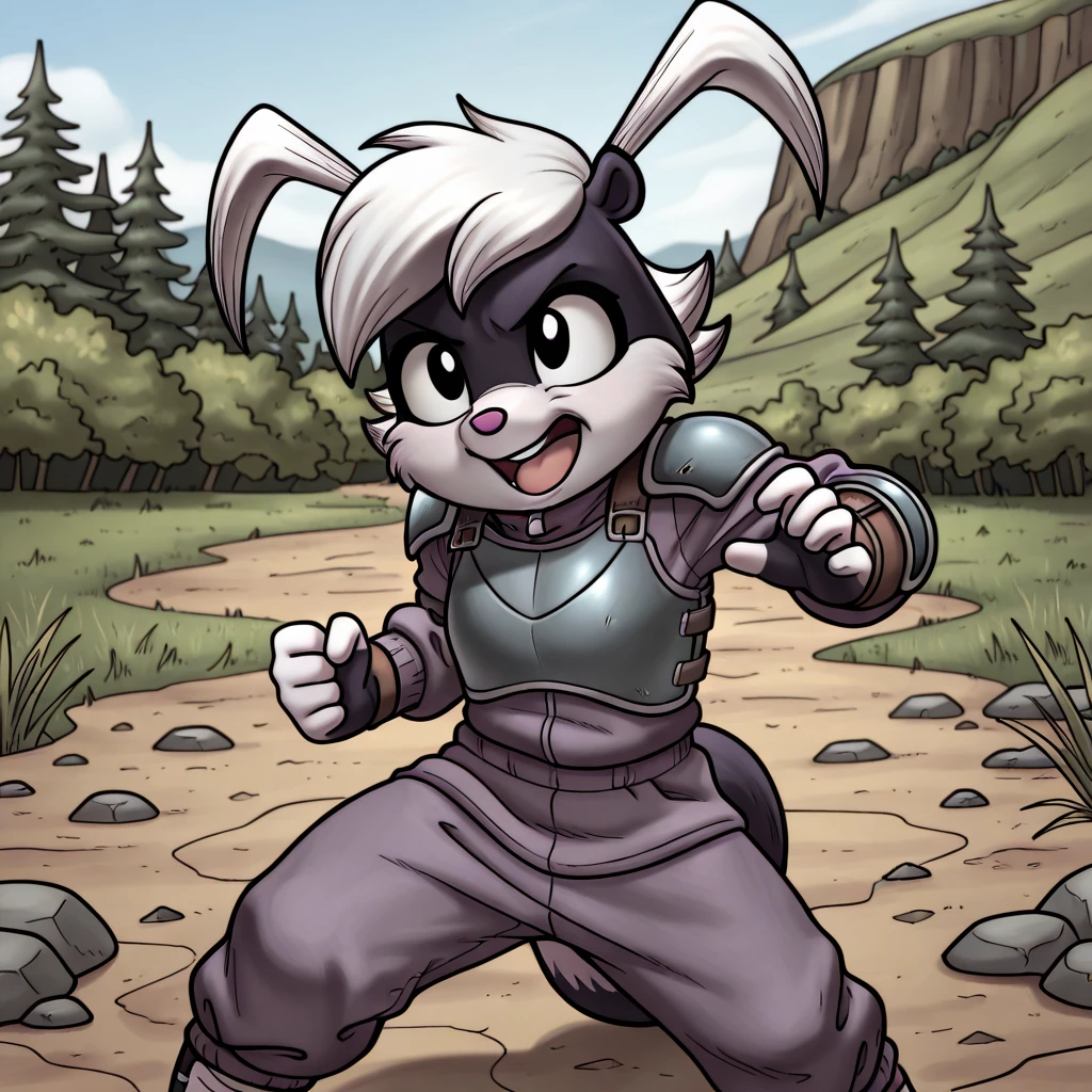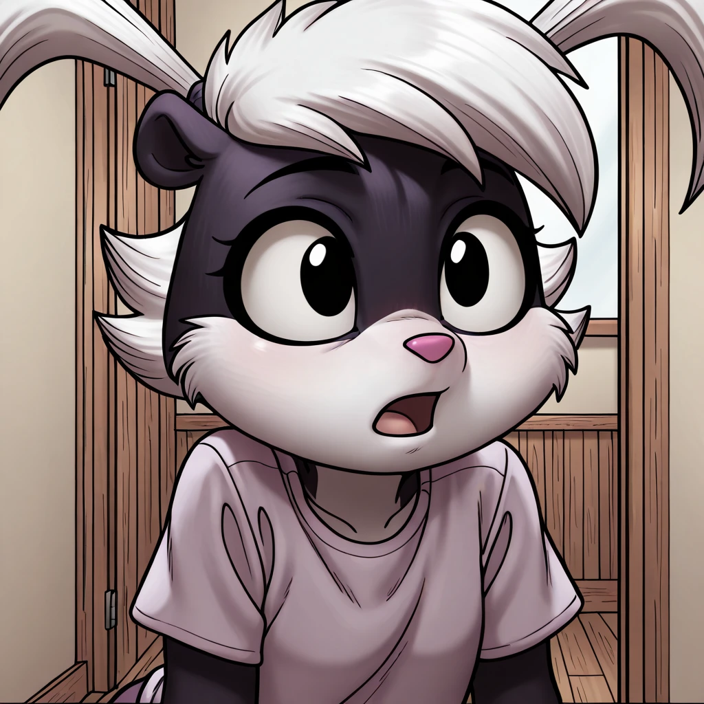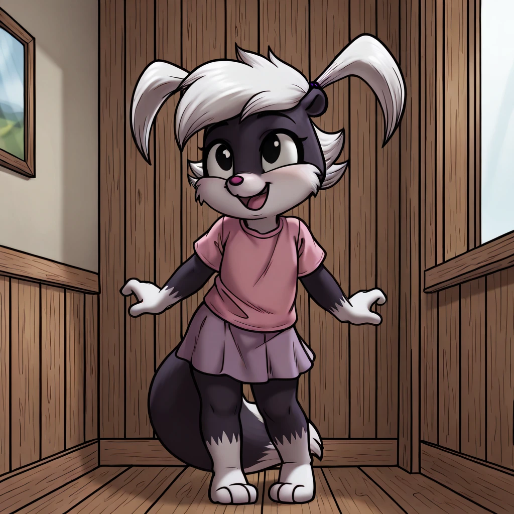tabitha, skunk, furry, 1girl, two-tone fur, animal nose, white hair, long twin tails, black eyes, furry female,