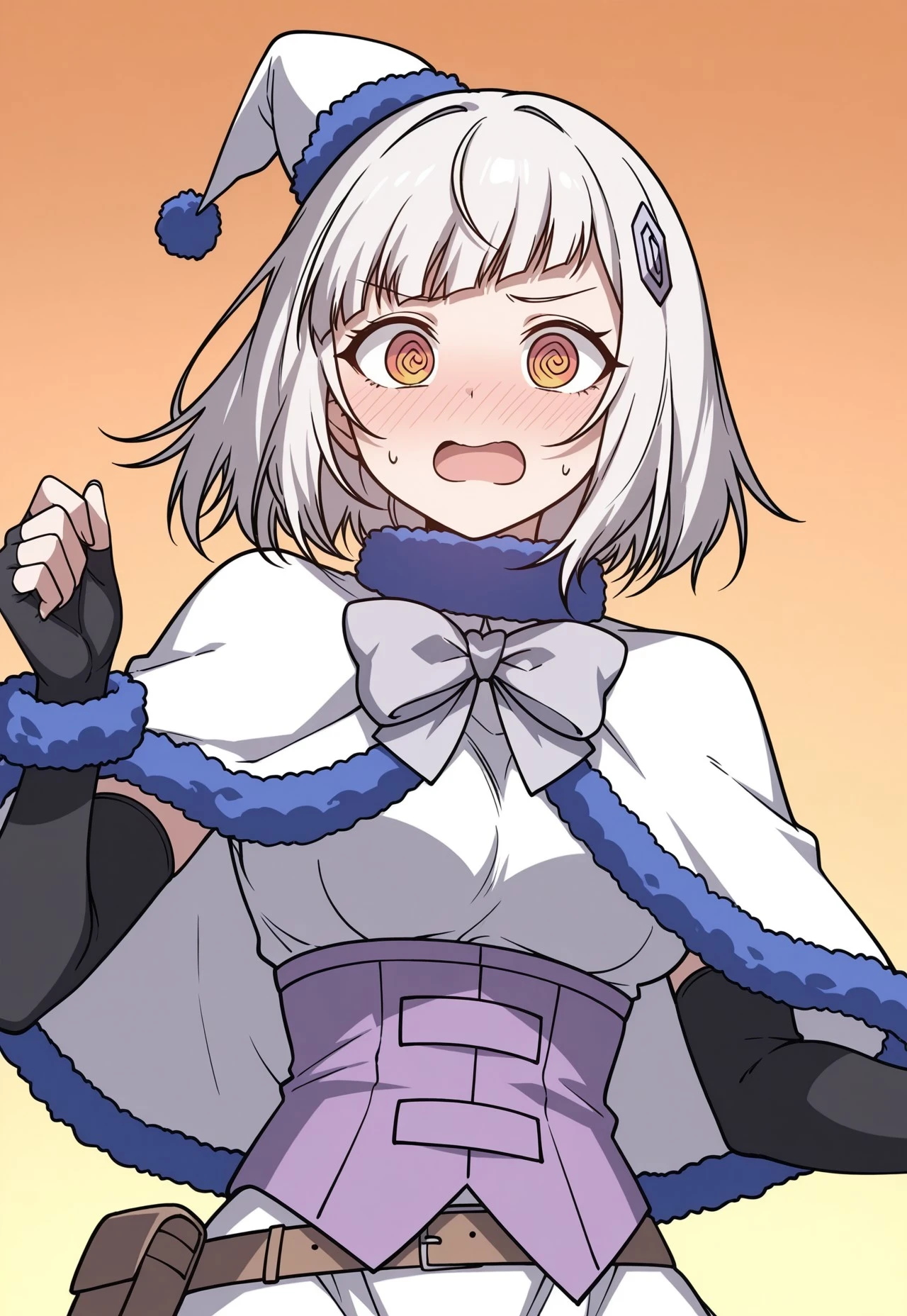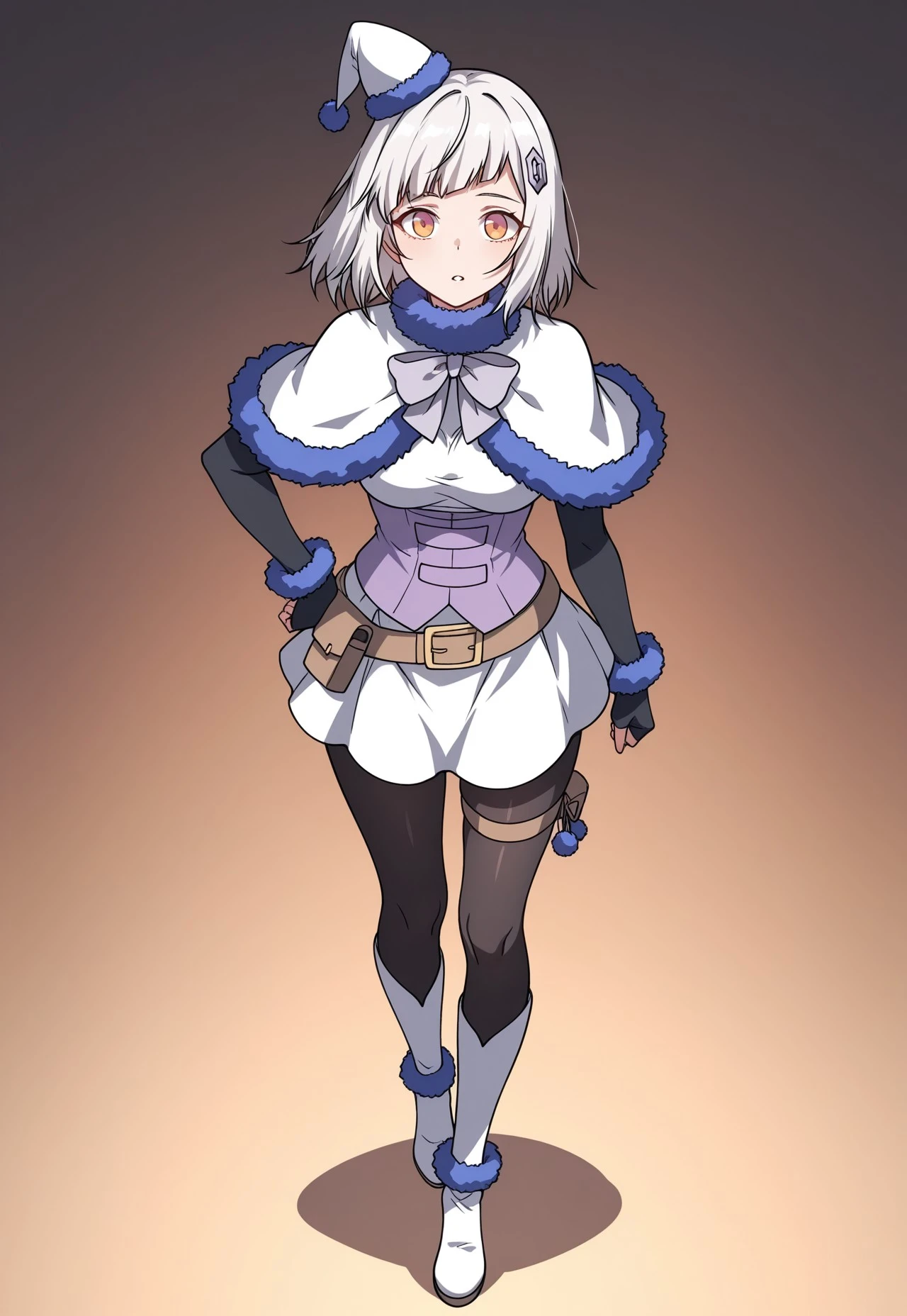 santa hat, mini hat, hair ornament, hairclip, fur-trimmed capelet, bowtie, fur collar, corset, black gloves, elbow gloves, fingerless gloves, fur bracelet, belt pouch, white dress, short dress, thigh strap, black pantyhose, white knee boots, anklet fur accessory