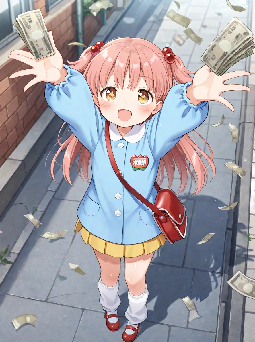 long hair, very long hair, pink hair, two side up, hair ornament, bangs, hair bobbles, red hair bobbles, brown eyes, yellow eyes, kindergarten bag, shoulder bag, kindergarten uniform, name tag, blue shirt, long sleeves, yellow skirt, pleated skirt, white legwear, socks, white socks, loose socks, mary janes, red footwear