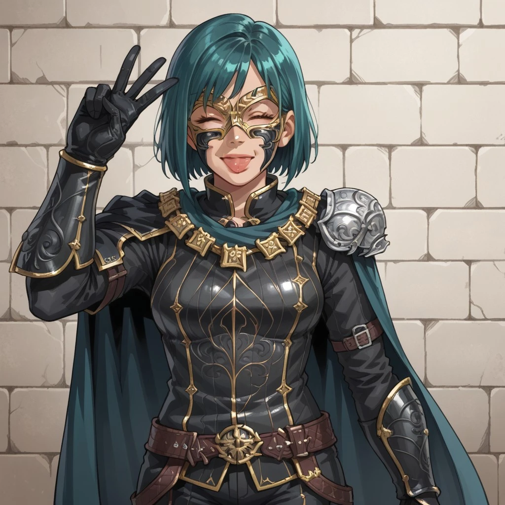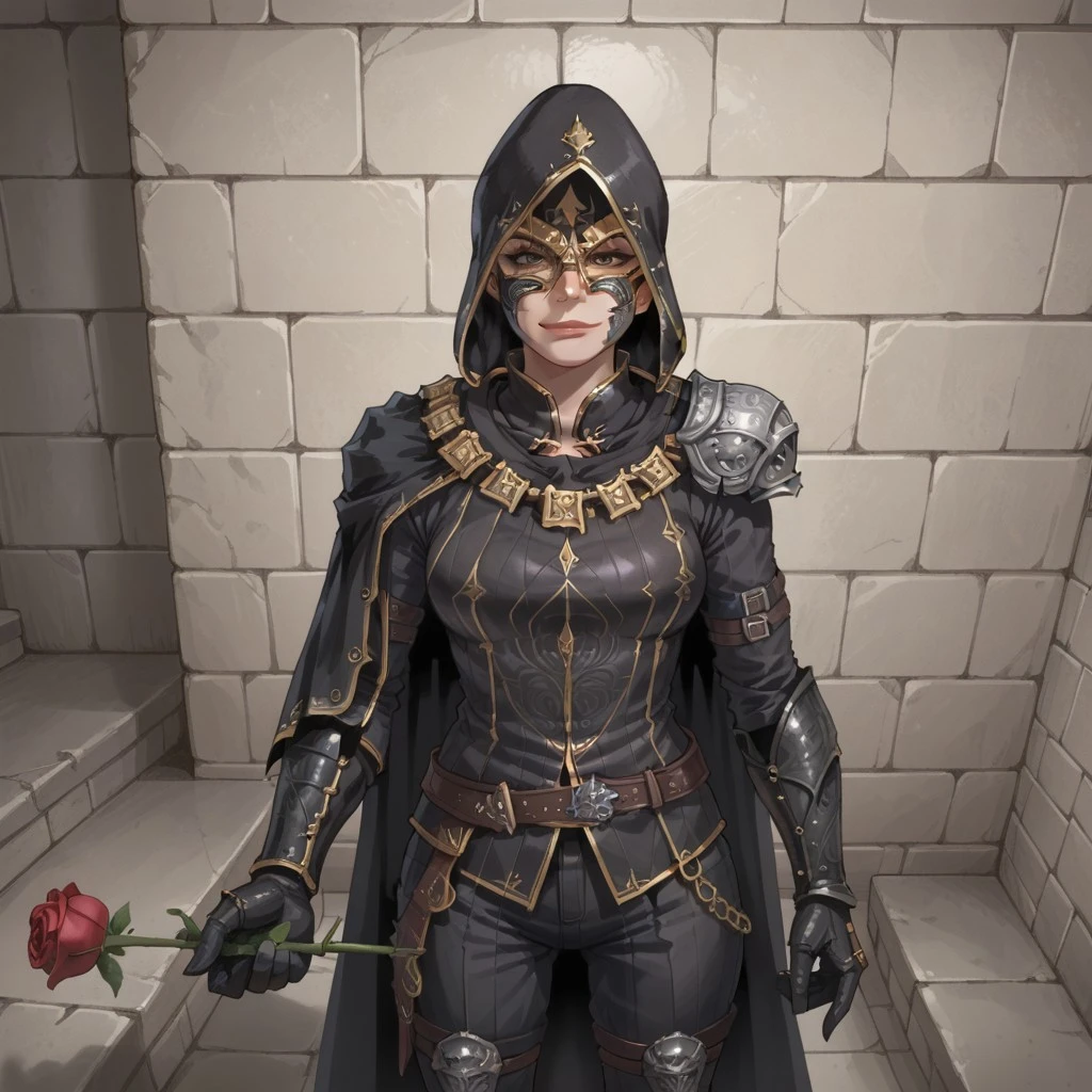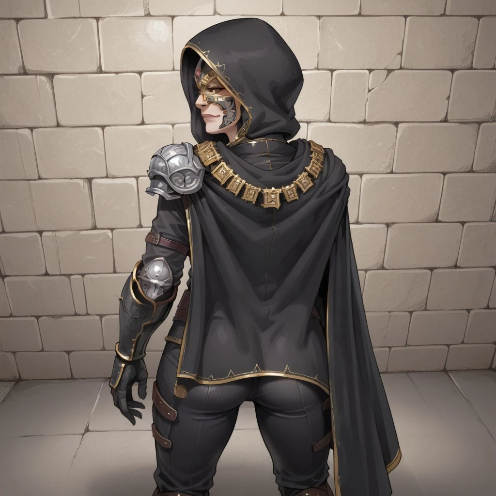 in general - 1girl,solo,armor,hood,mask,cape,pants,gloves,