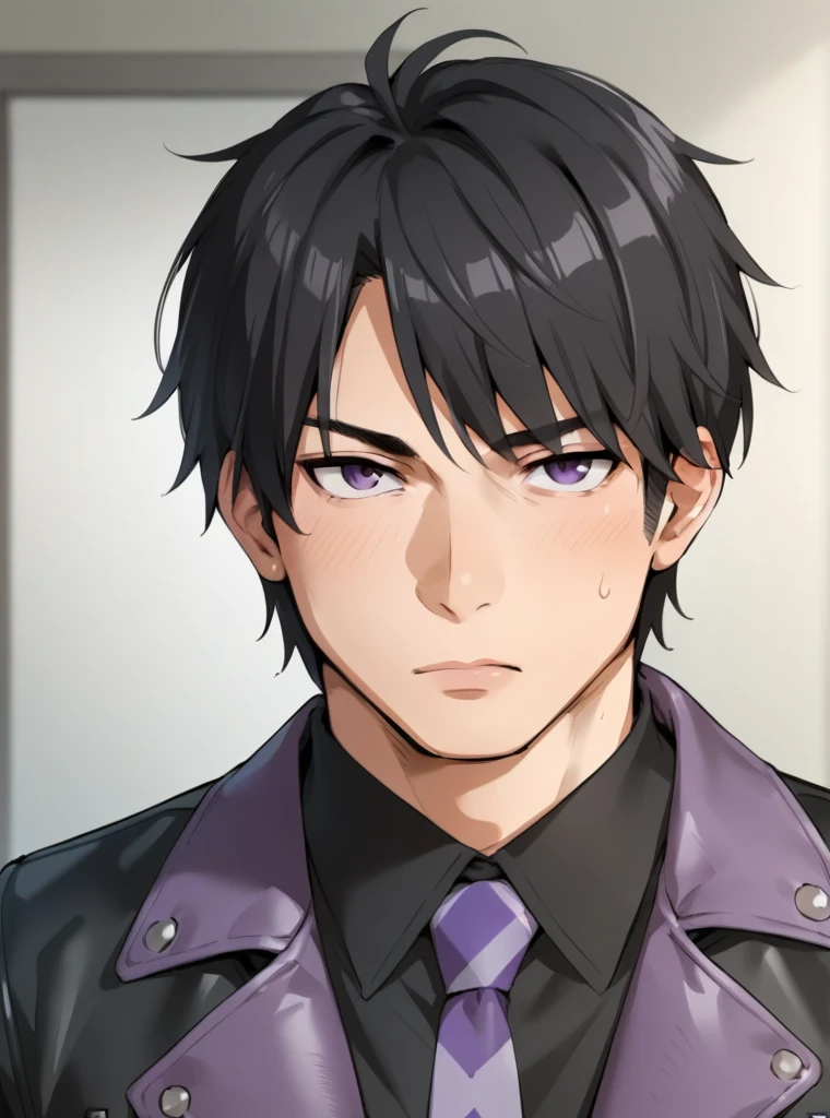 Recommended prompt: kuroganesupana, leather jacket, black jacket, black shirt, necktie, purple tie