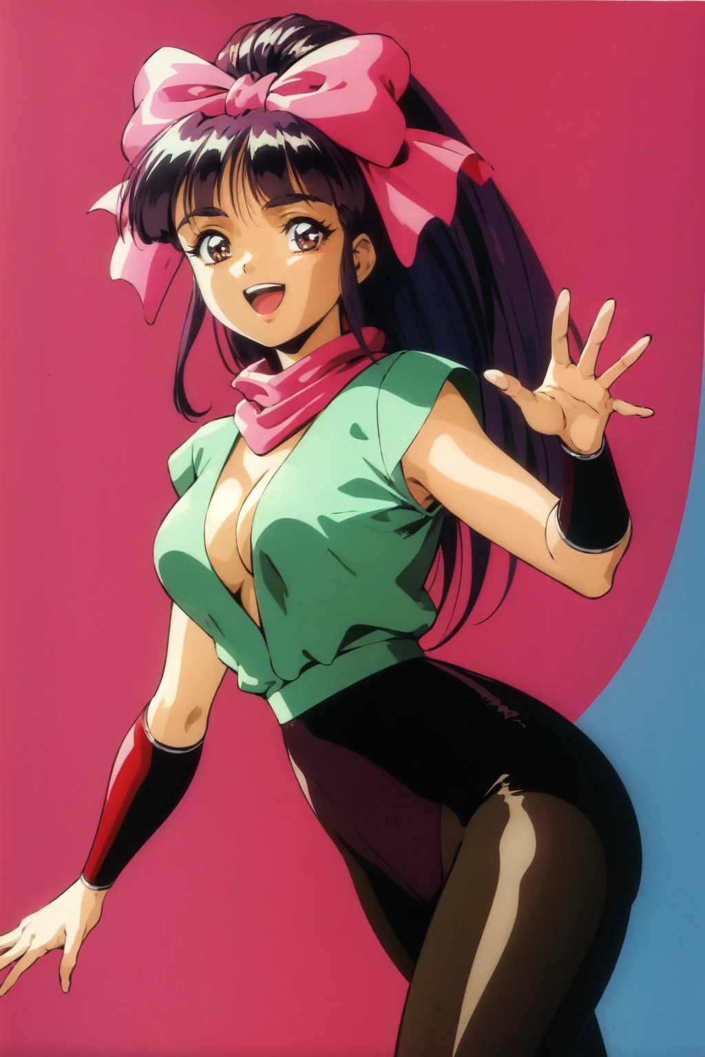 hair bow, scarf, sleeveless shirt, arm guards, pantyhose, boots, cleavage