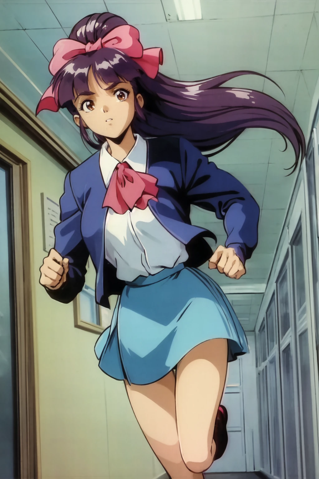 hair bow, school uniform, ascot, jacket, shirt, skirt