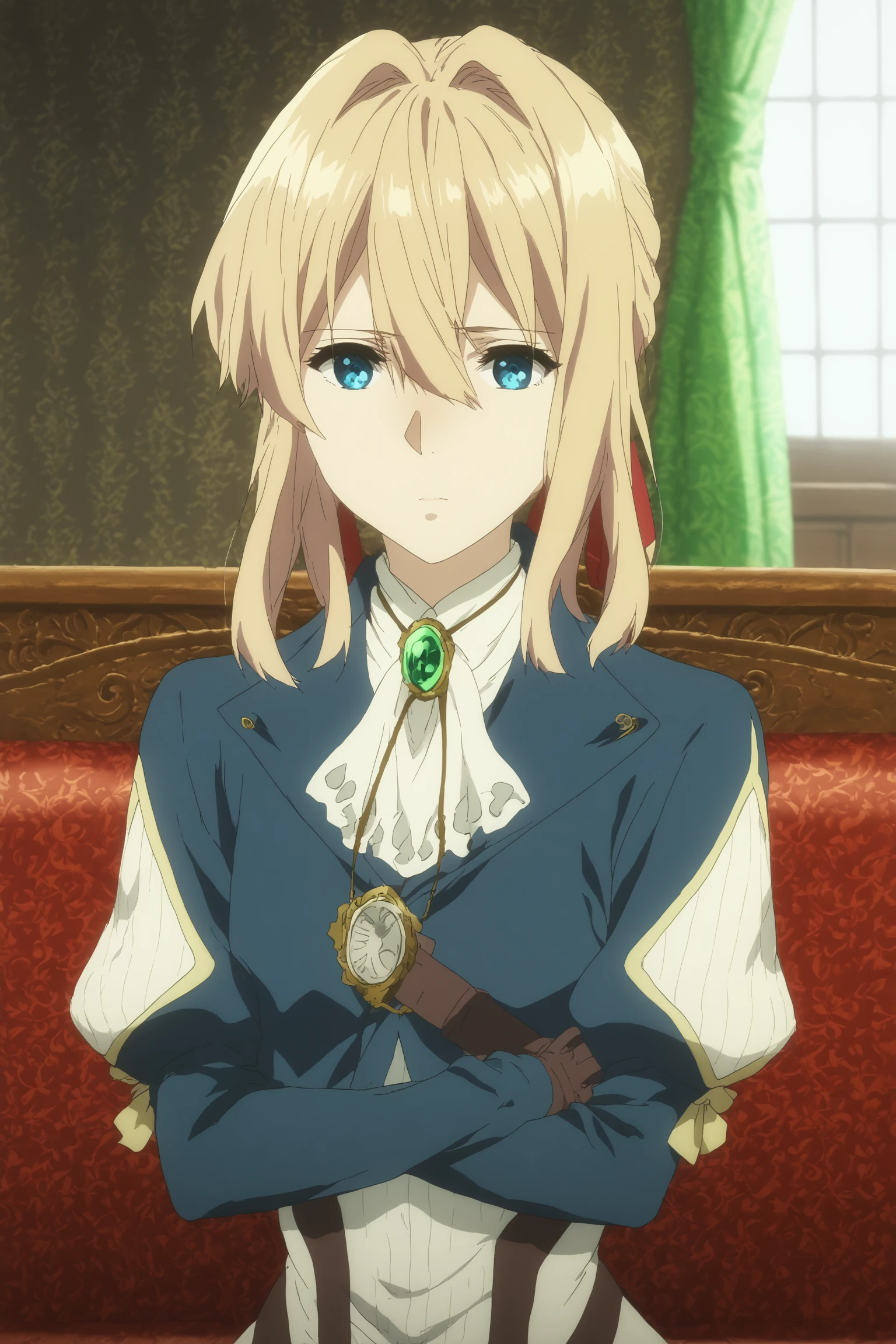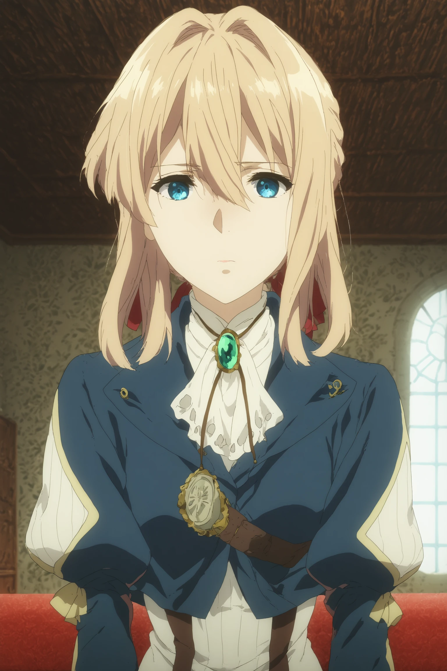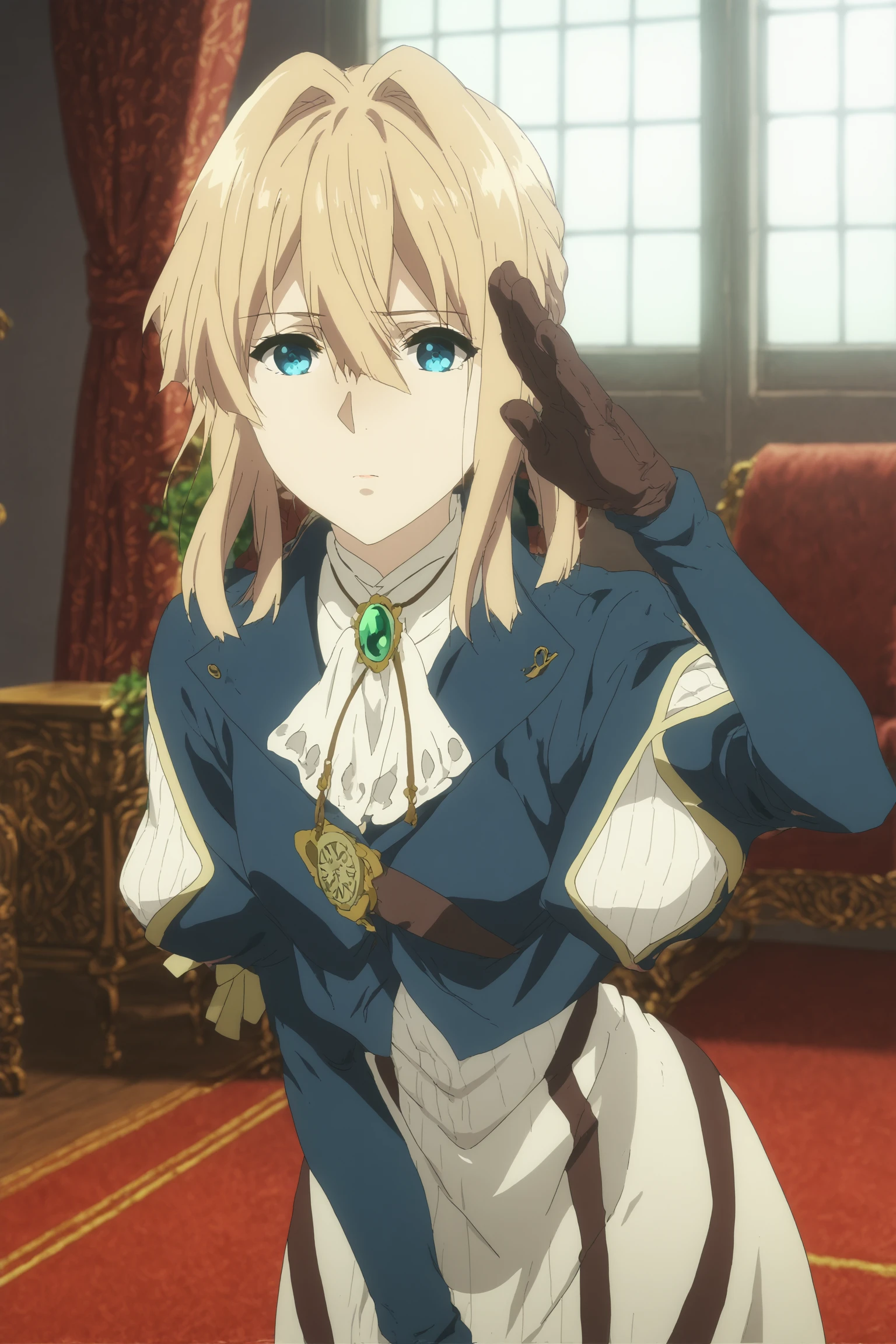 Triggers : violet evergarden,1girl,solo,hair between eyes,long hair,long sleeves,shirt,bangs,looking at viewer,collared_shirt, hair intakes,closed mouth, hair ribbon,brown gloves,blue jacket,jacket,jewelry,white ascot,puffy sleeves
