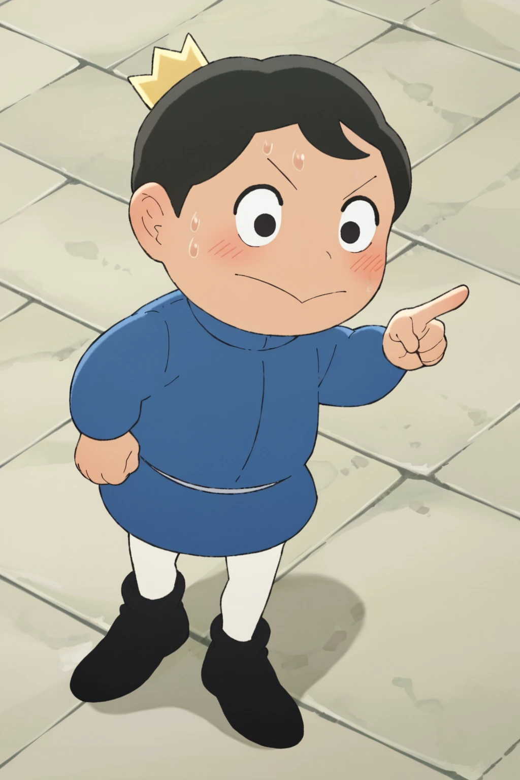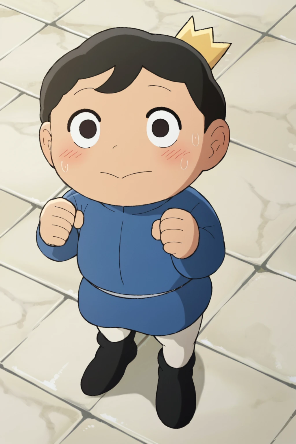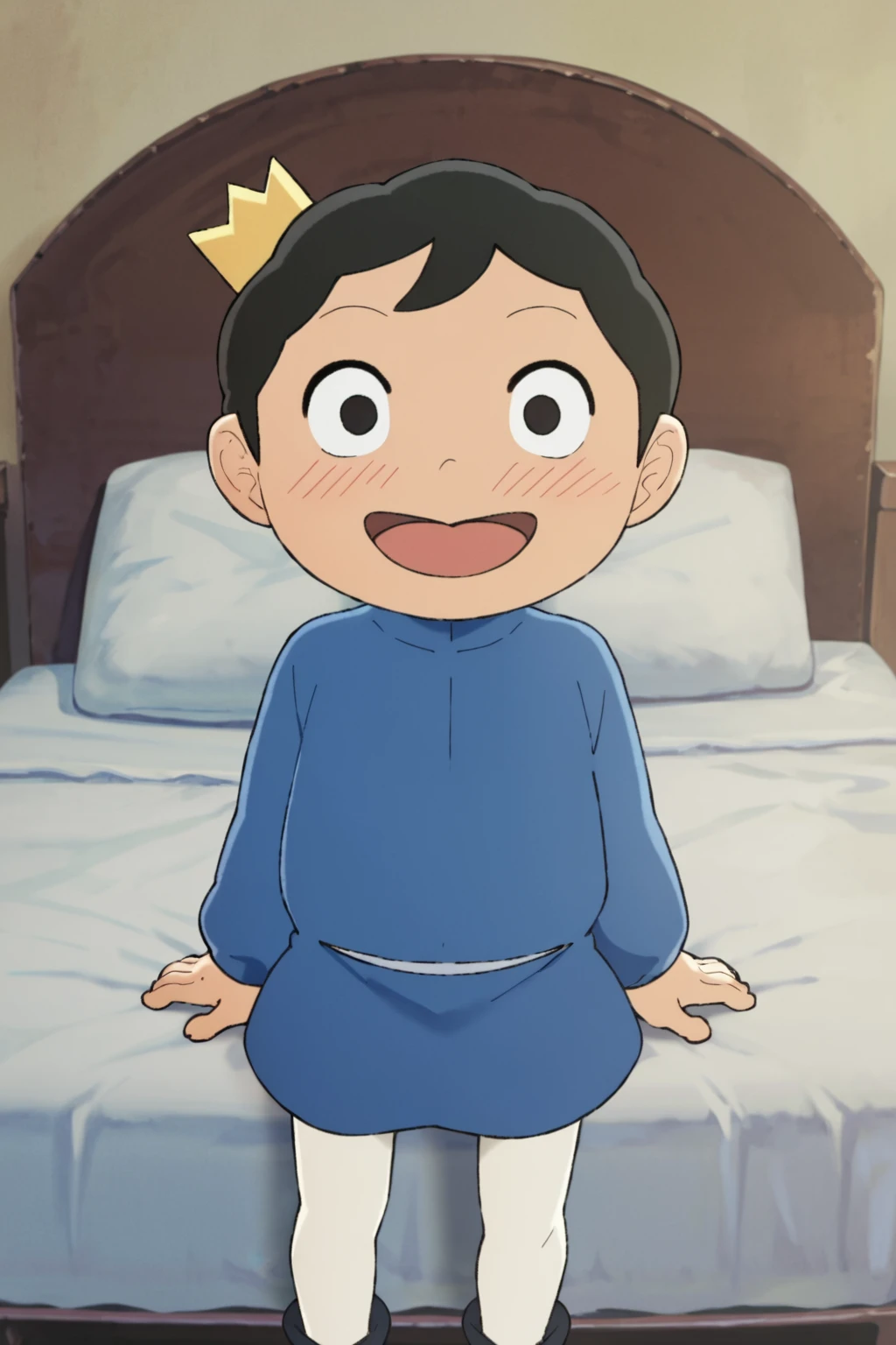 boji, black hair, black eyes, blue shirt, white pants, black shoes, mini crown,