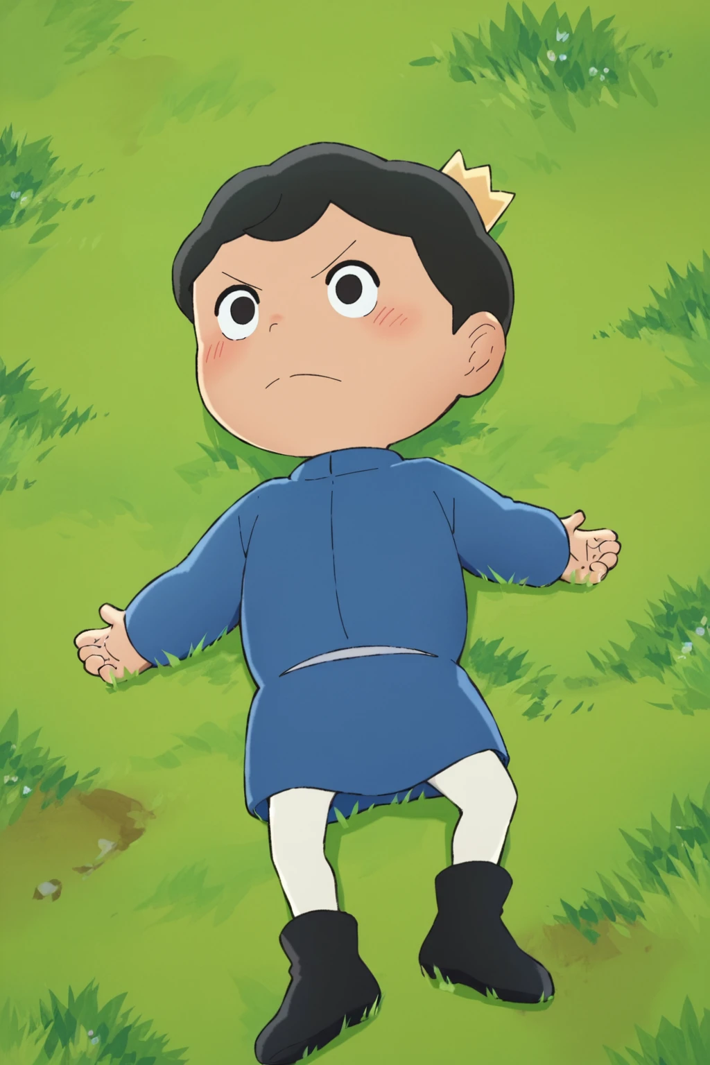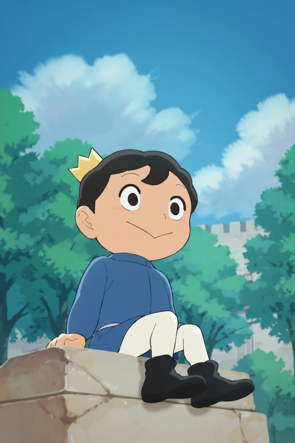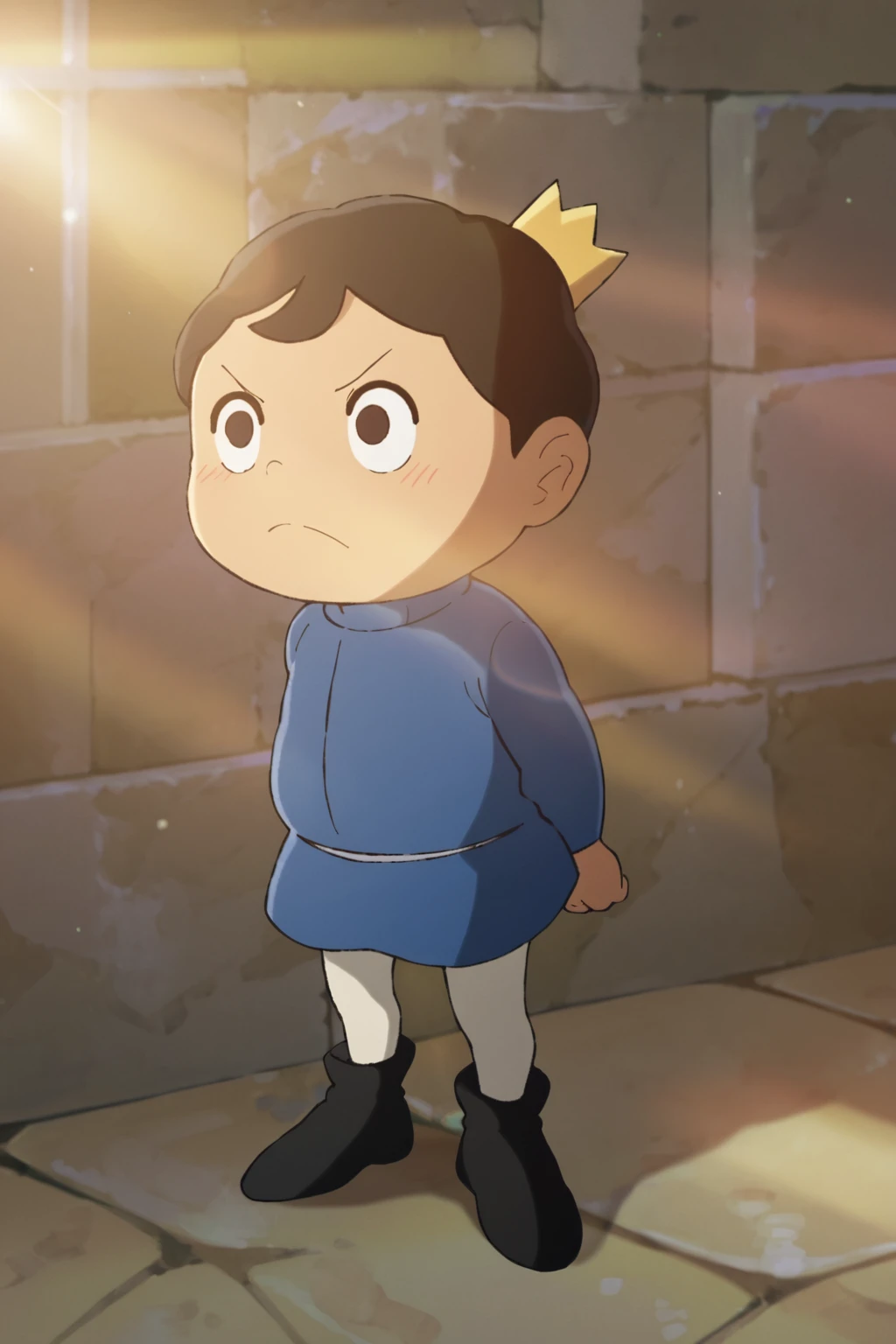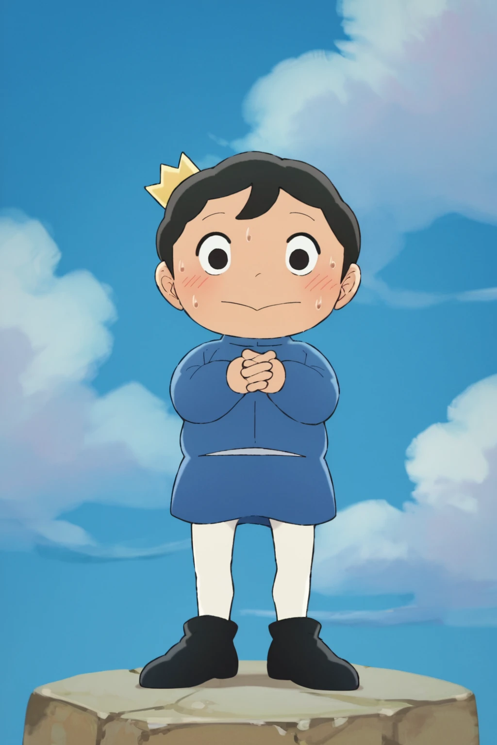 boji, black hair, black eyes, blue shirt, white pants, black shoes, mini crown,