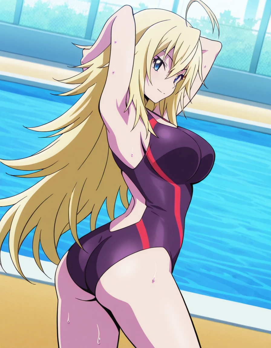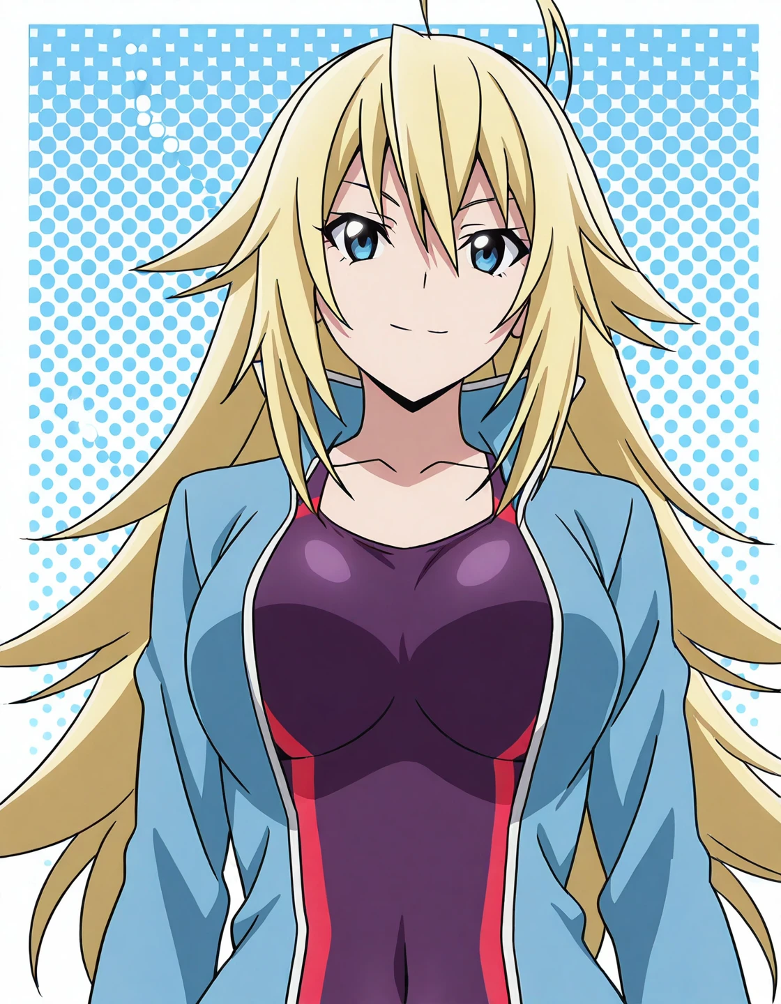 She has long, silky blonde hair, captivating blue eyes, and a curvy, well-toned figure that reflects her rigorous athletic training. Mio is instantly recognizable by her flirtatious expressions and graceful posture, both in and out of competition. Her outfits mostly include her distinctive Keijo training and competition swimsuits, along with casual clothing that highlights her elegant yet mischievous charm.