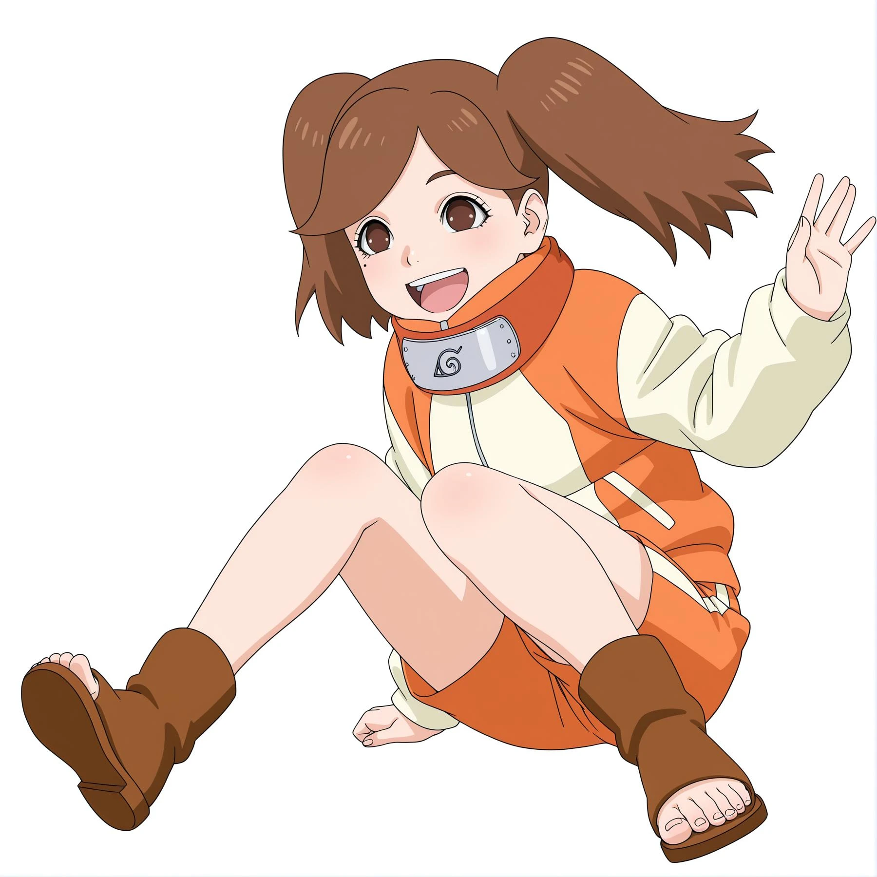 namida1, namida2, cute face, twintails, split bangs, bangs, mole under right eye, brown hair, brown eyes, short hair, long sleeve jacket, beige orange jacket, orange beige jacket, orange shorts, brown open toe shoes,