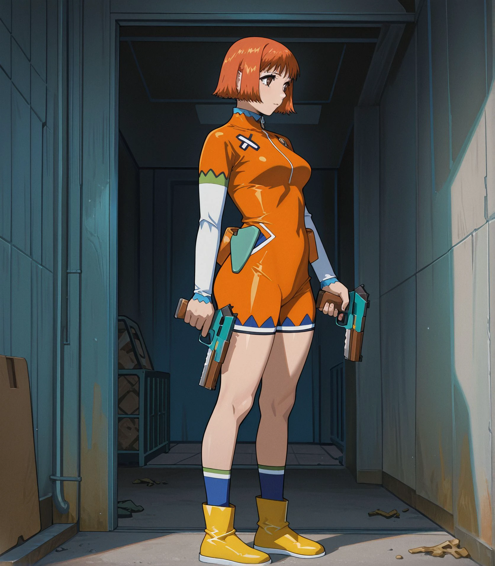 orange bodysuit, yellow boots,blue socks,holding gun,
