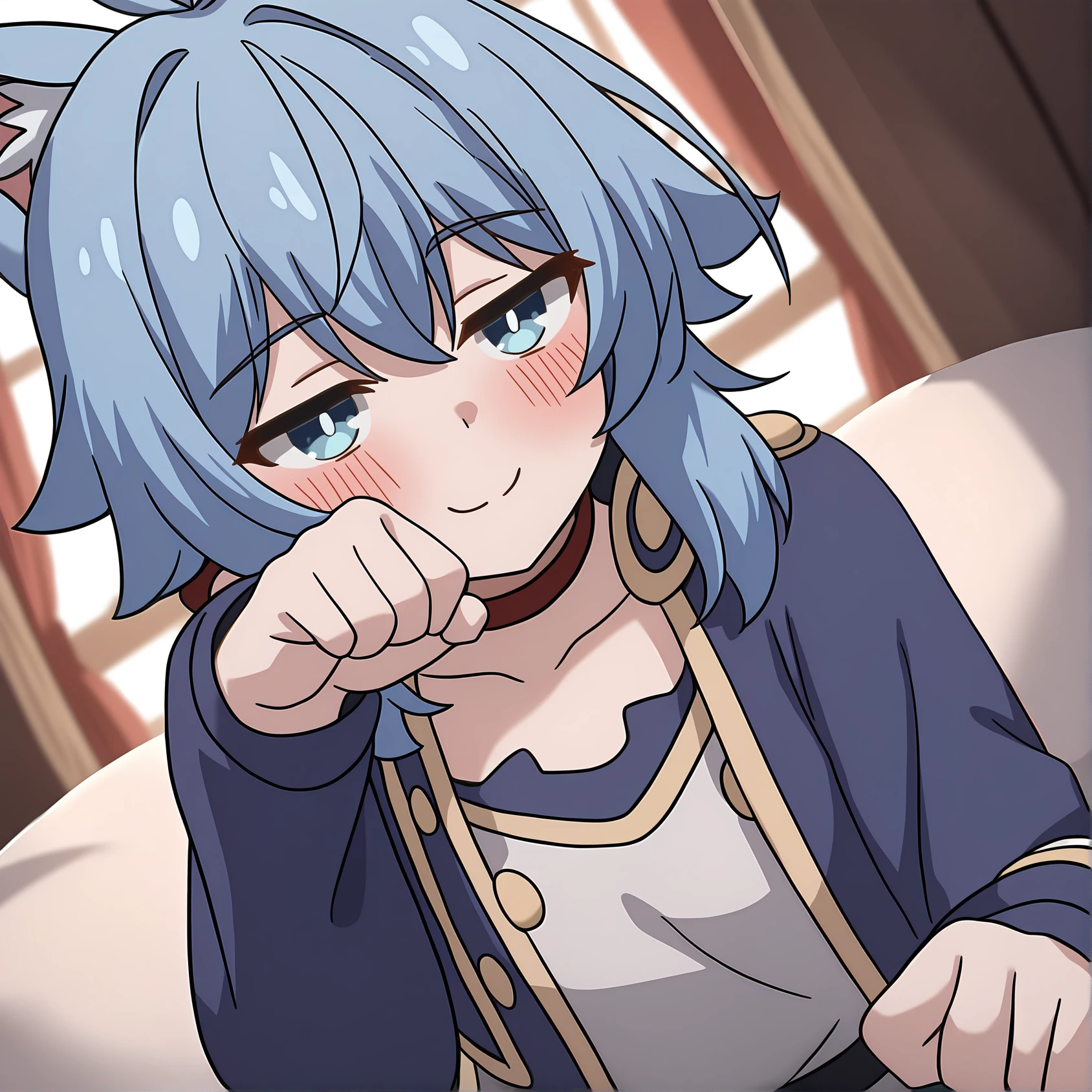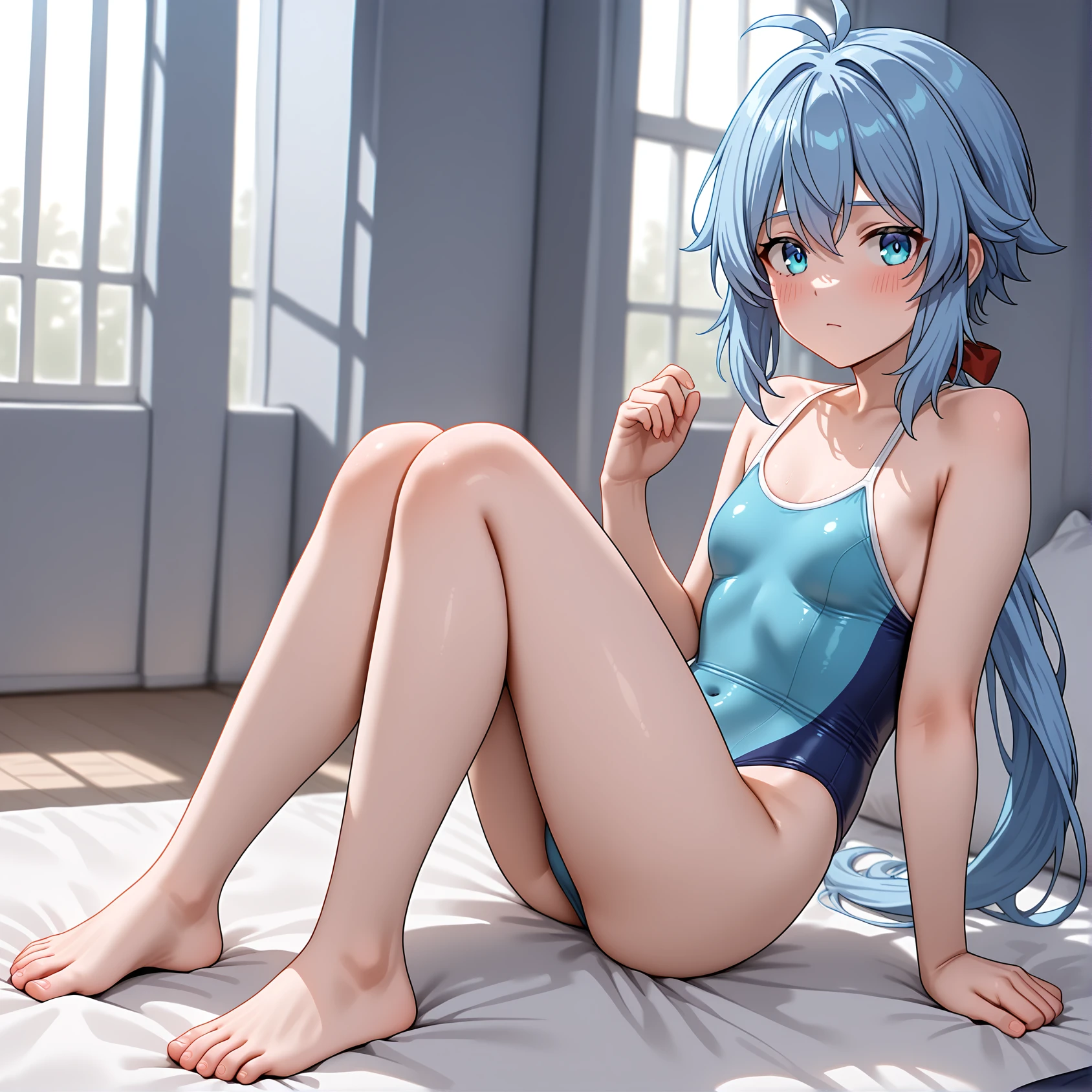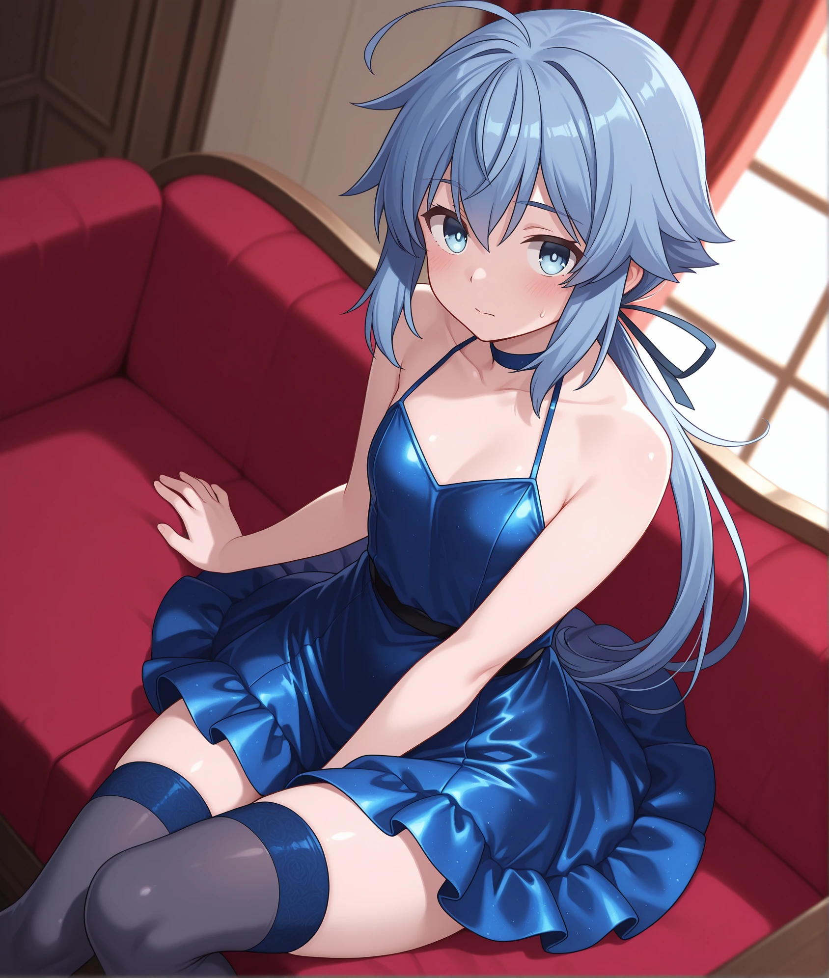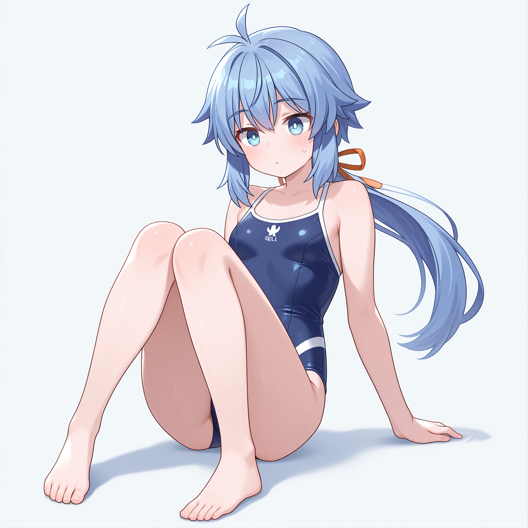 riel,blue hair,blue eyes,low ponytail,