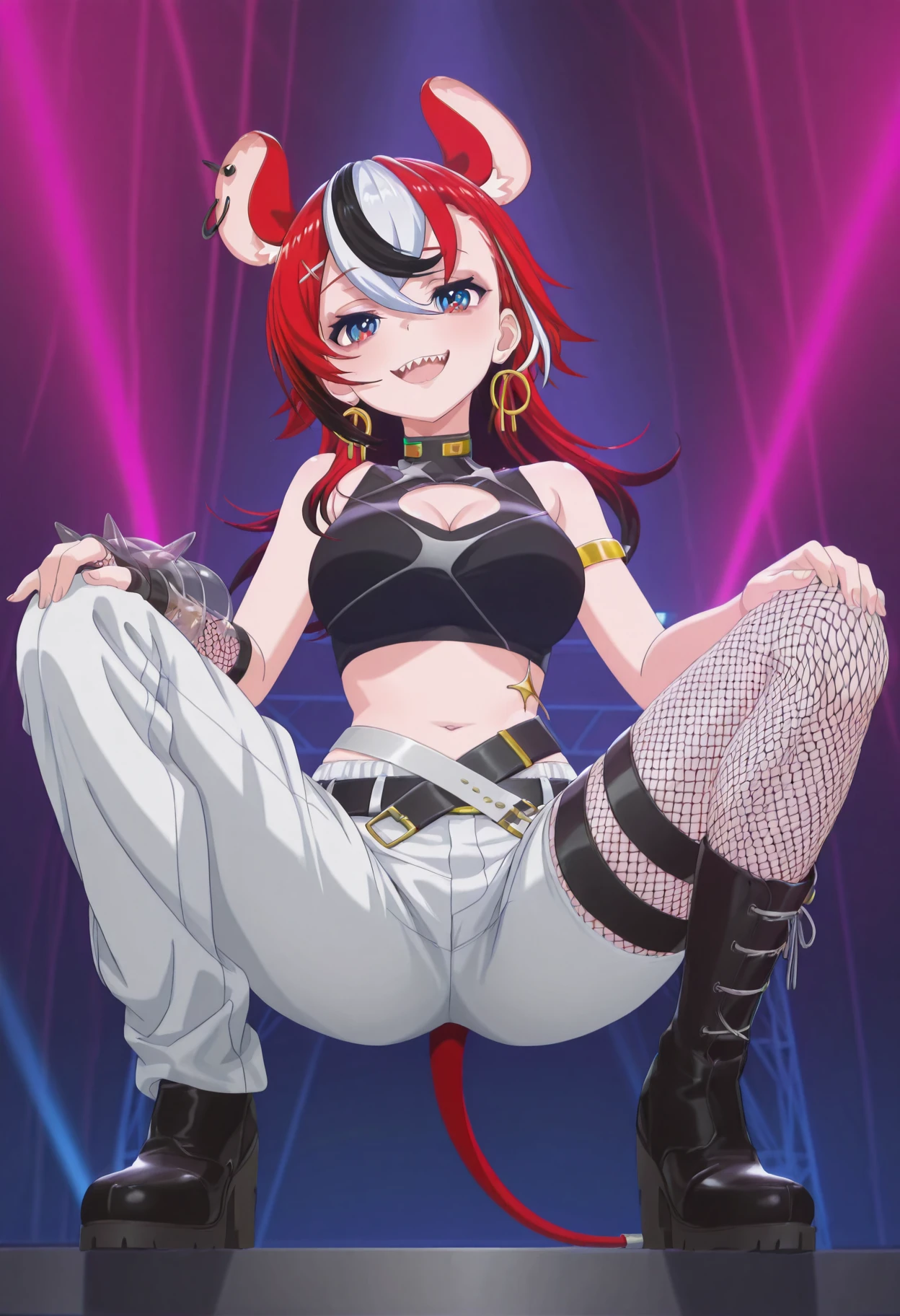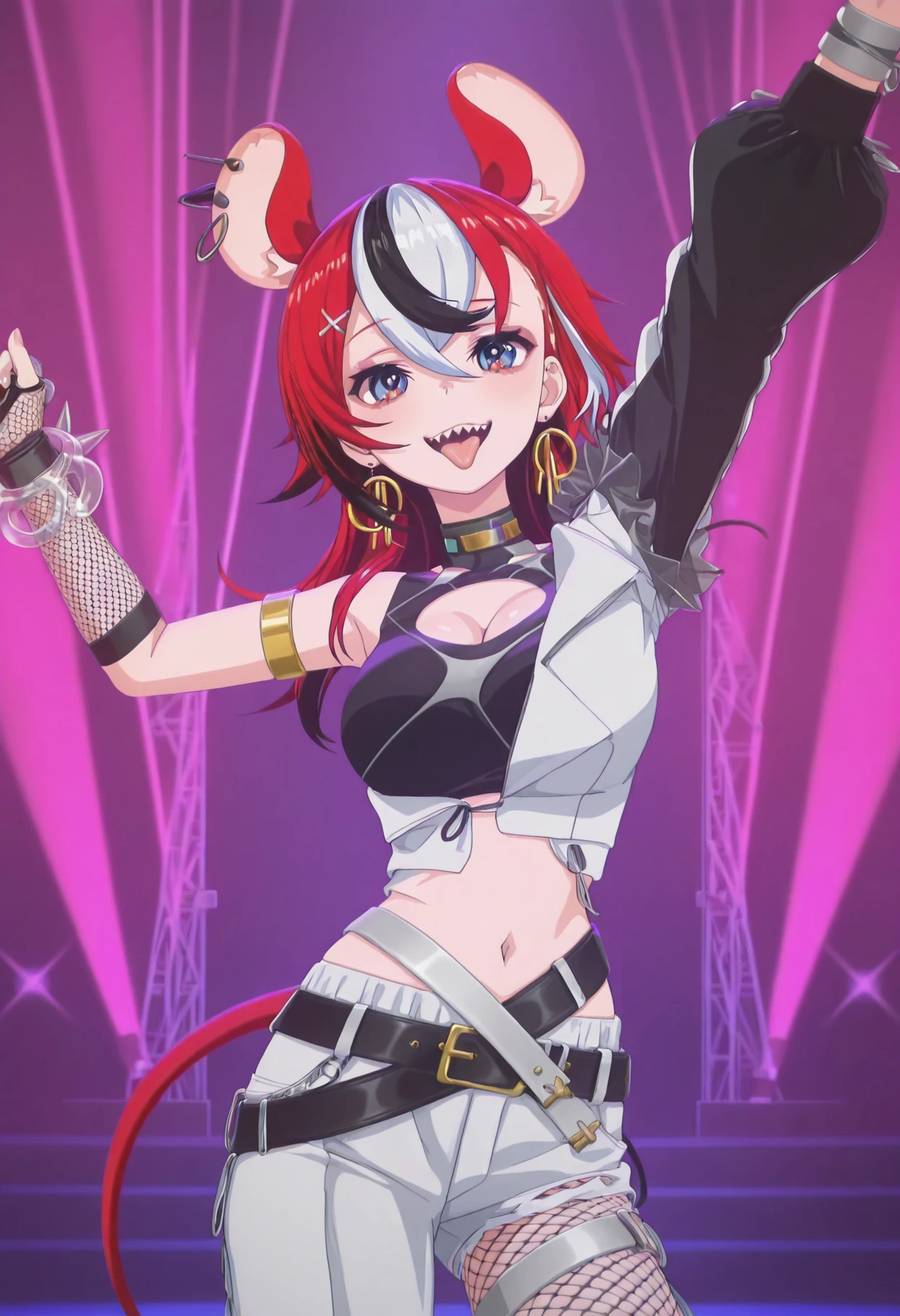 hakos baelz, short hair, multicolor hair, streaked hair, red hair, blue eyes, rat ears, choker, black crop top, cleavage cutout, medium breasts, armlet, spike glove, puffy glove, midriff, navel, belts, white pants, single fishnet stocking, rat tail, slight eyeliner,