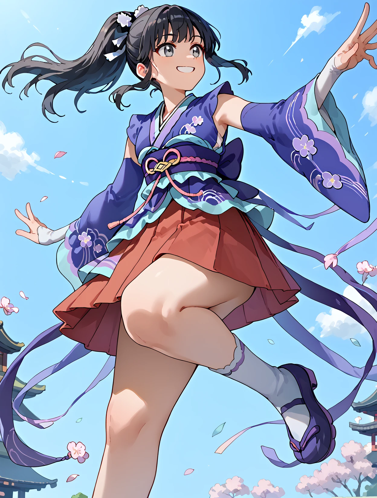 Outfit New Year: Daw_NYear, long hair, black hair, ponytail, sidelocks, grey eyes, hair ornament, hair ribbon, purple kimono, detached sleeves, blue sleeves, red skirt, pleated skirt, white socks,