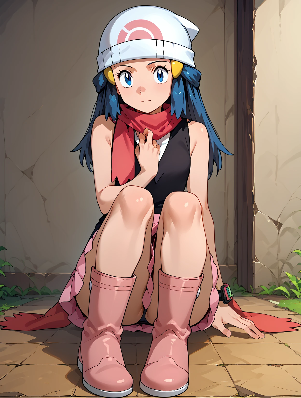 Outfit Diamante y Perla: Dawn_PD, long hair, blue hair, blue eyes, hair ornament, beanie, white headwear, red scarf, sleeveless shirt, black shirt, bracelet, pink skirt, boots, pink footwear,