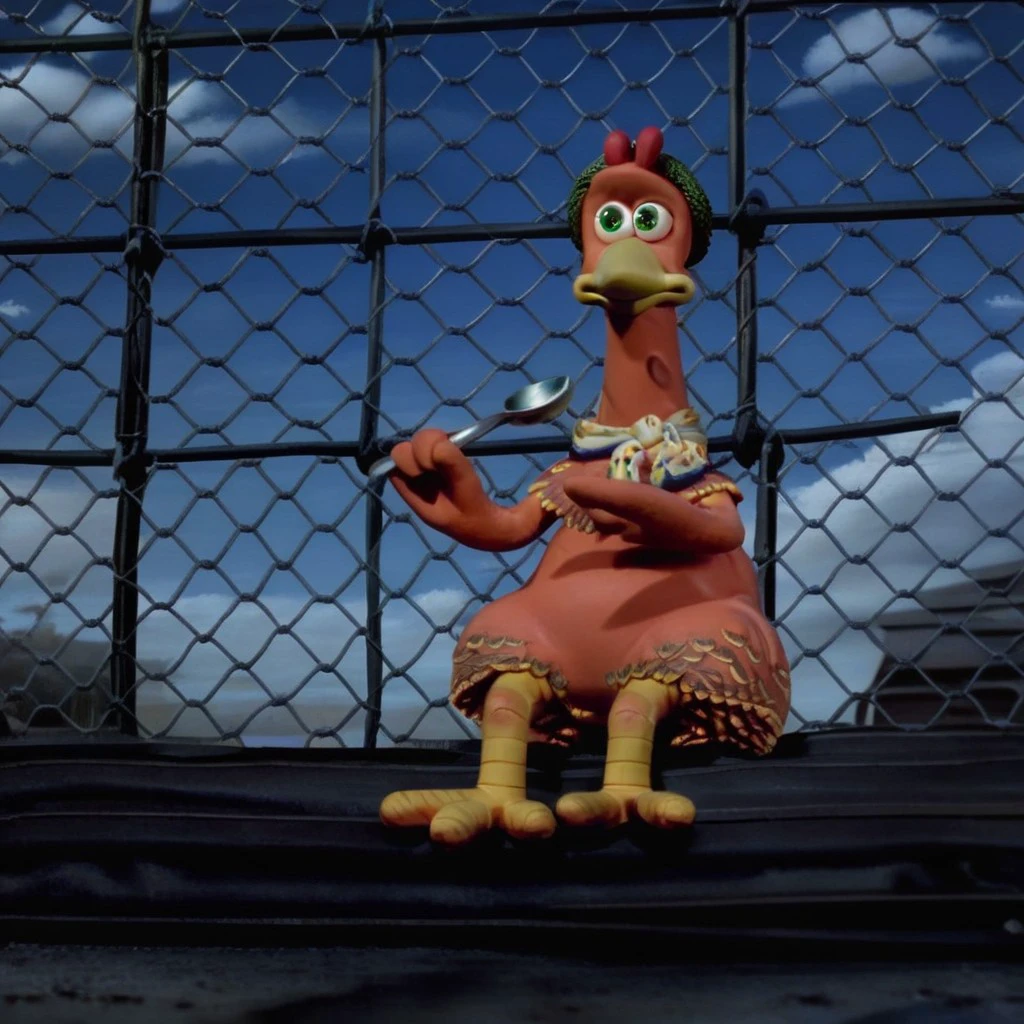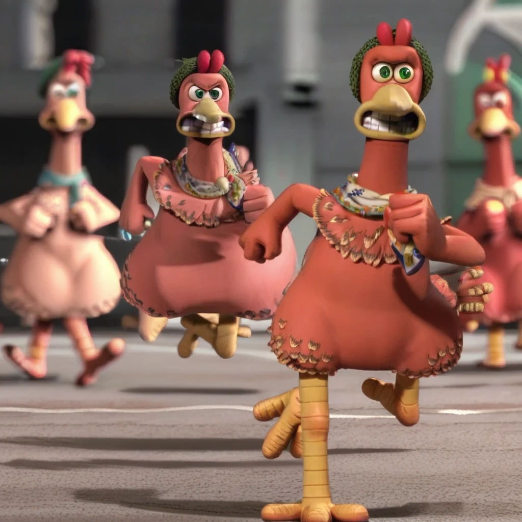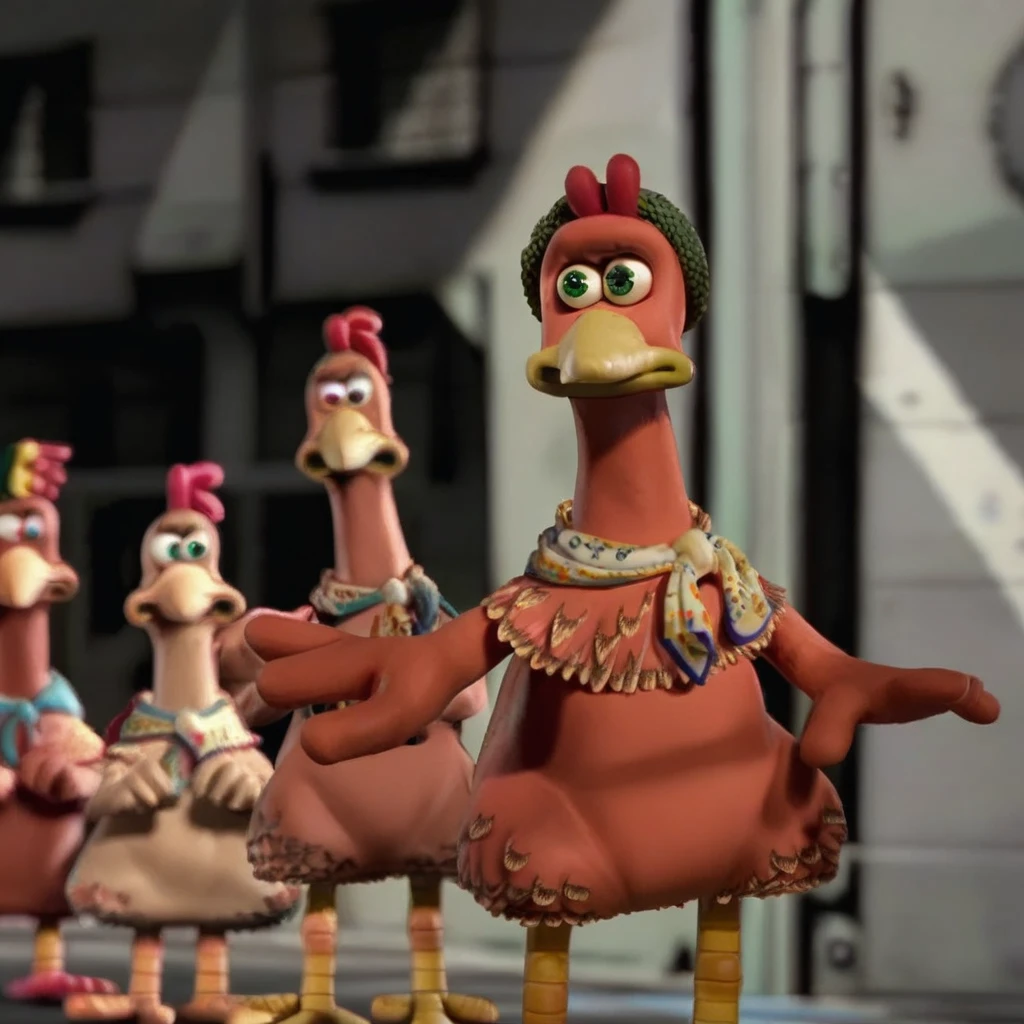 Gingercr, cartoon chicken character, vibrant orange feathers, oversized yellow feet,green eyes, green beanie , 2 red chicken comb on head, cream-coloured chiffon neck scarf, scarf, floral patterns scarf, chicken girl, stop motion style, blurry background