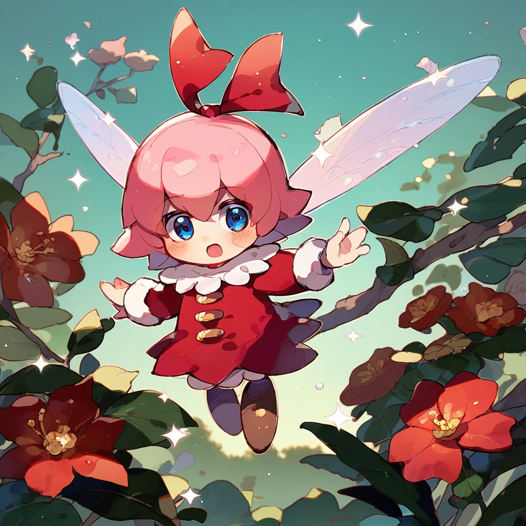 1 girl,blue eyes, pink hair, wings, fairy, red ribbon, fairy wings, red dress, short hair, ribbon\kirby