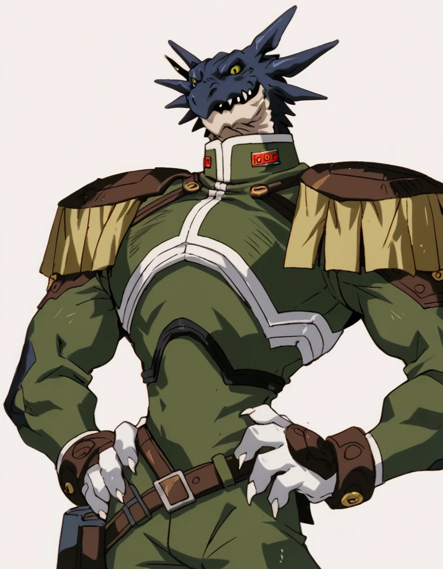 duuz, dragon, military uniform, furry male, 1boy, 1990s \(style\), solo, yellow eyes, uniform, epaulettes, teeth, gloves, no humans, fangs