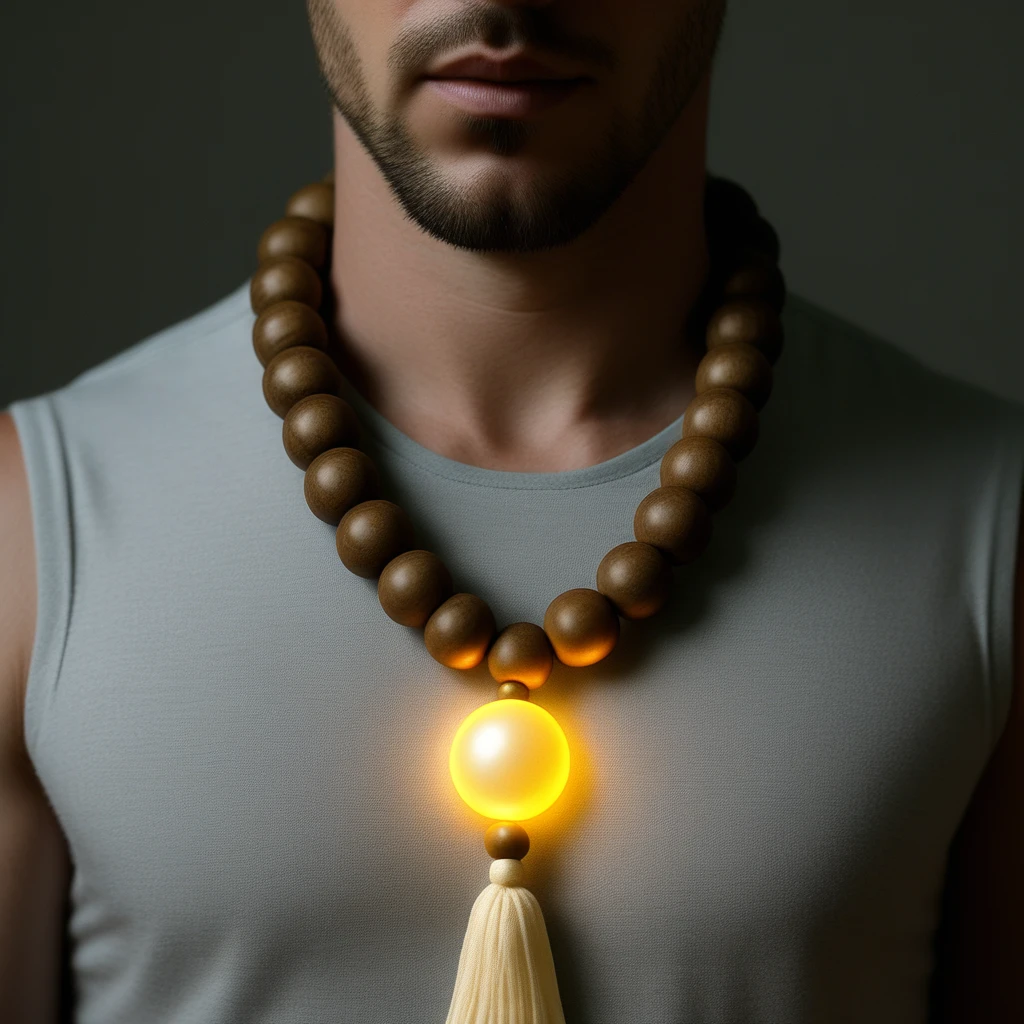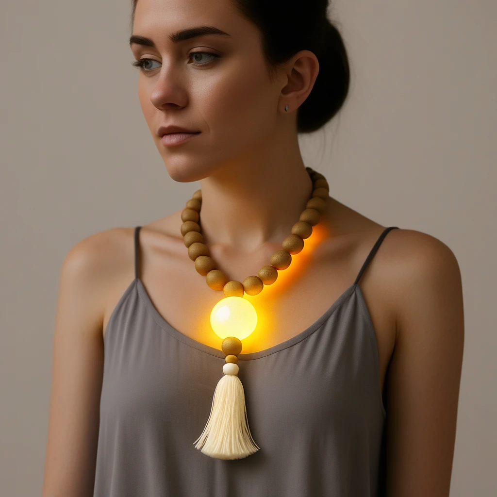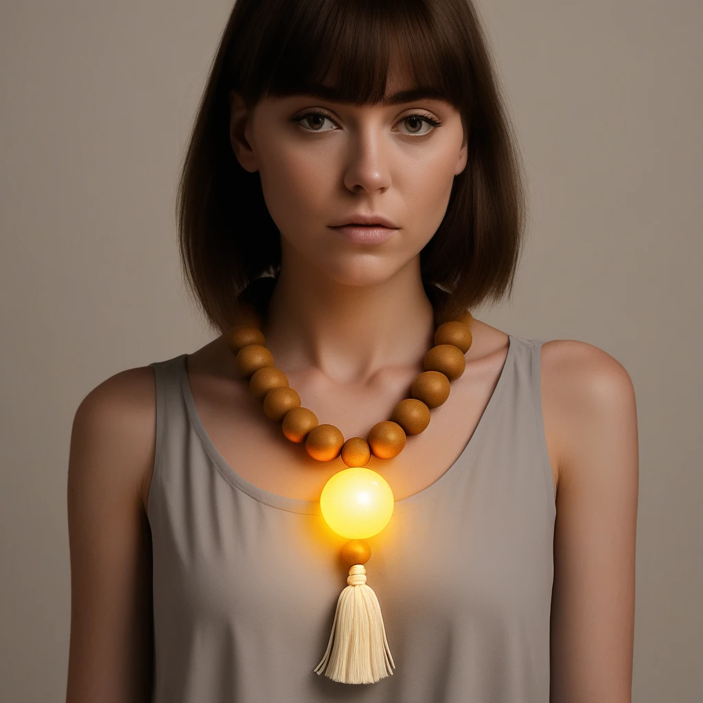 - "Close-up of a sacred_collar, glowing softly in warm light."