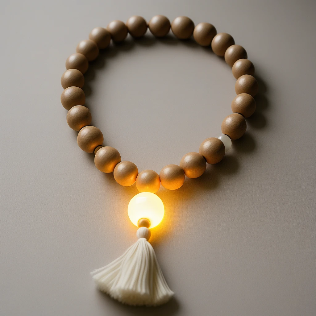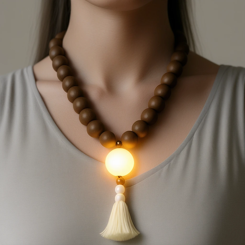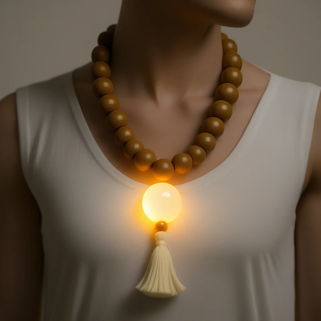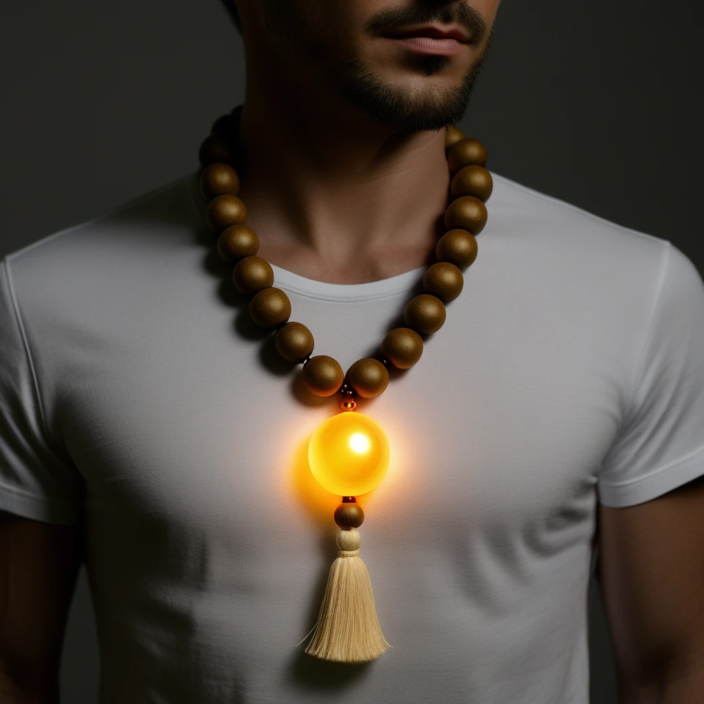 - "Close-up of a sacred_collar, glowing softly in warm light."