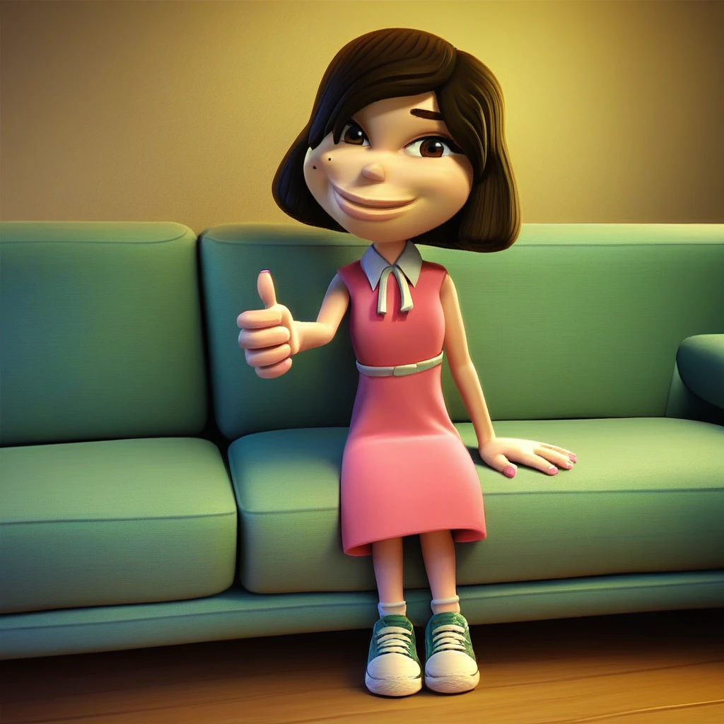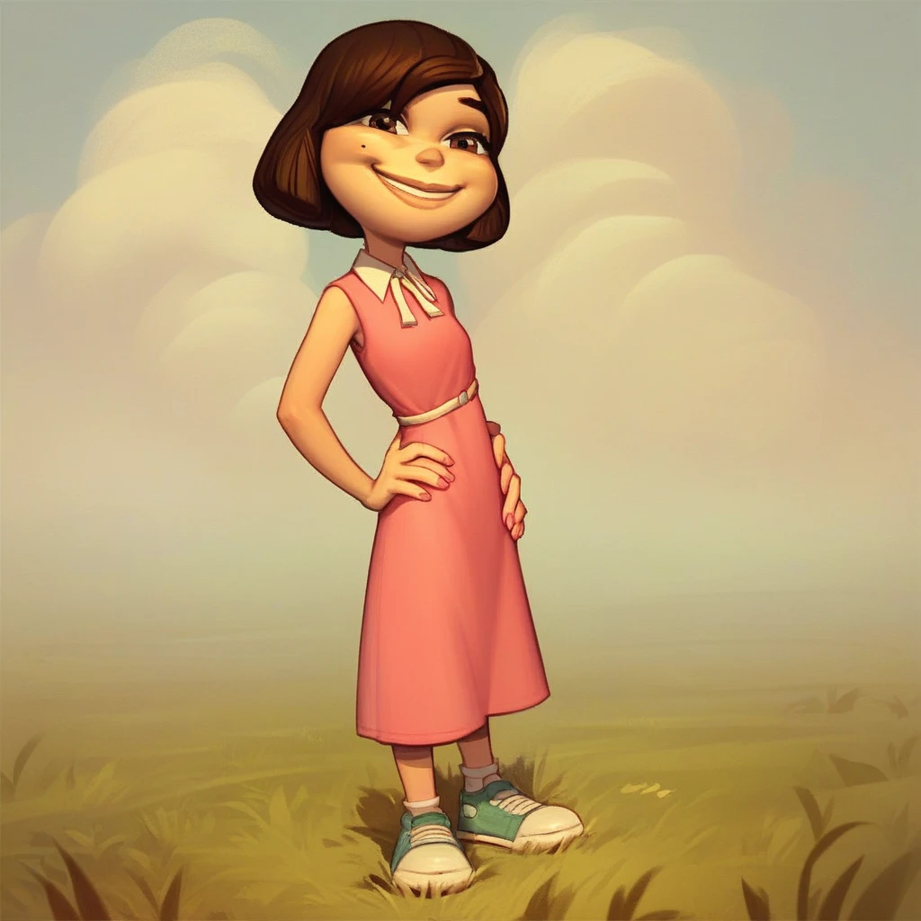 Default: J_N_B_Q, brown hair, bob cut, mole on cheek, collared dress, pink dress, sleeveless dress, neck ribbon, ankle socks, sneakers, pink footwear, pink nails,