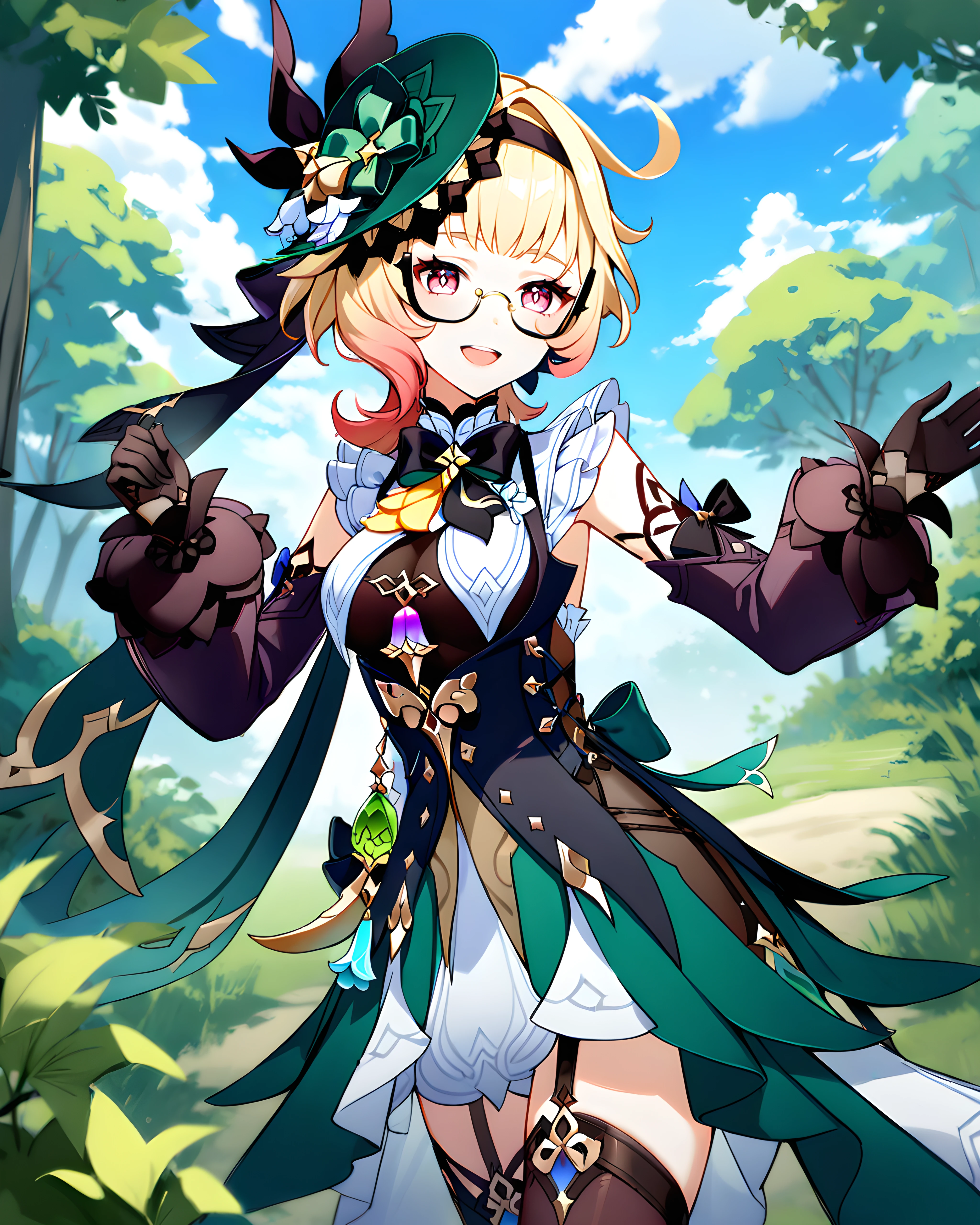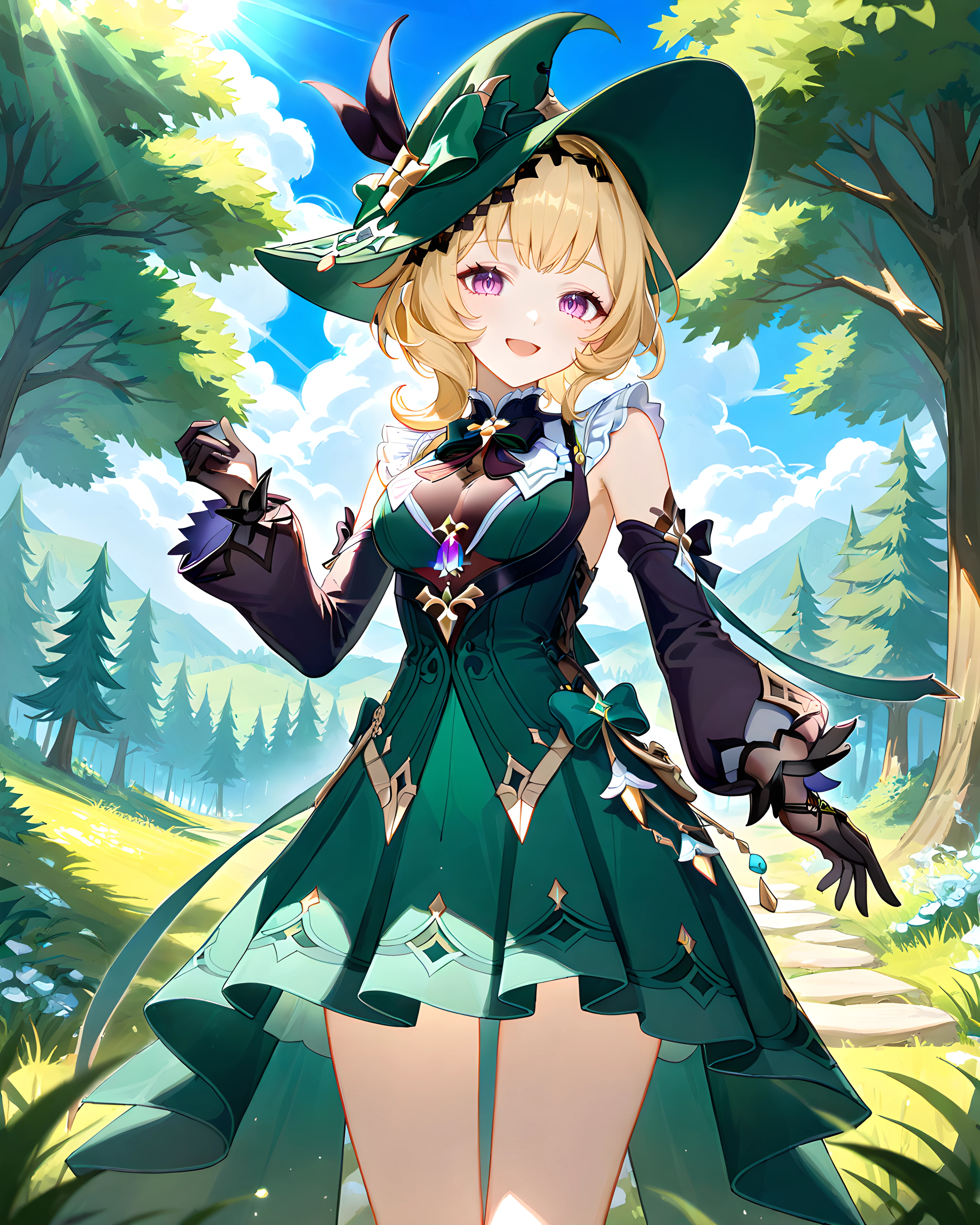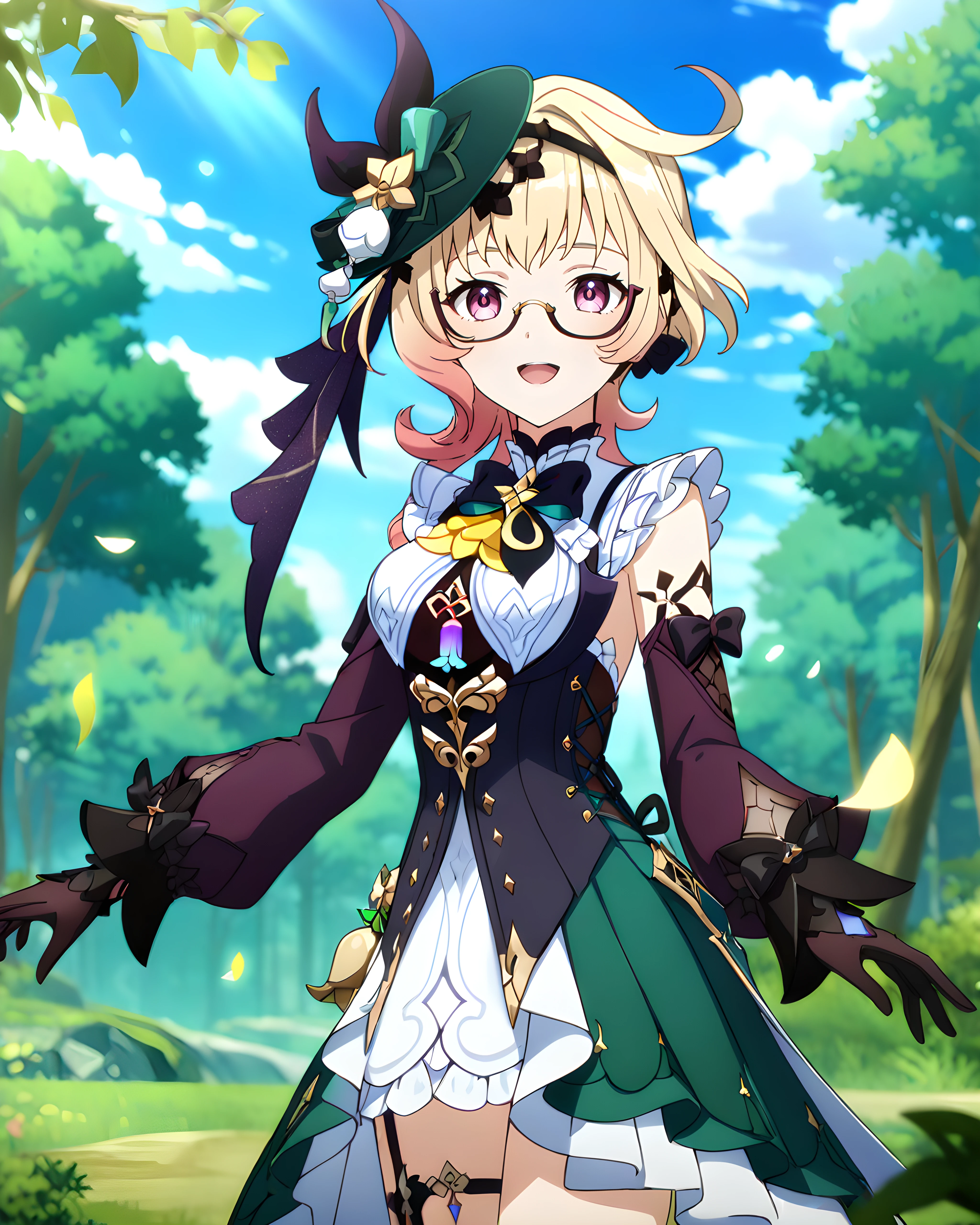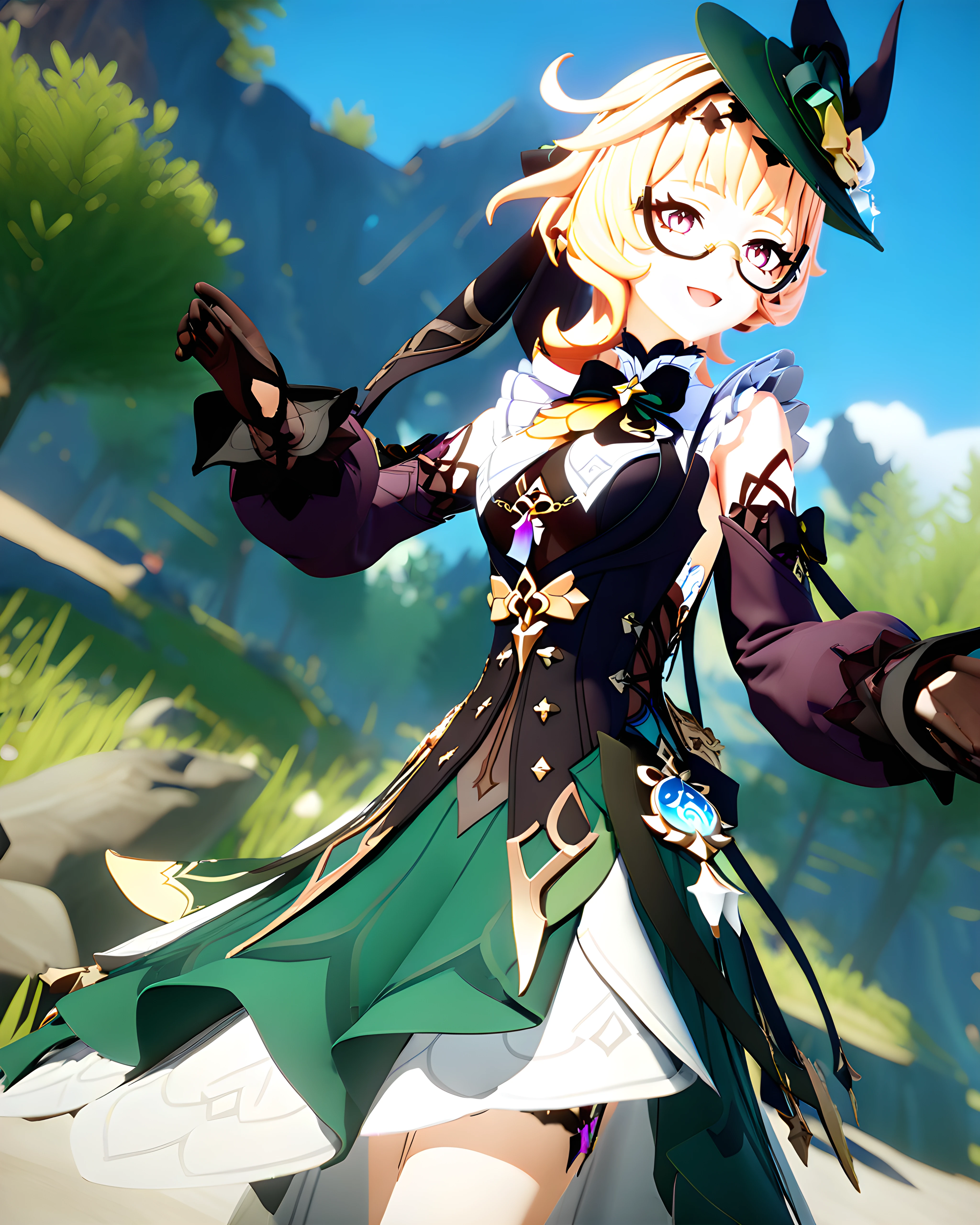 Emilie \(Genshin Impact\), green hat, green dress, detached sleeves, black gloves